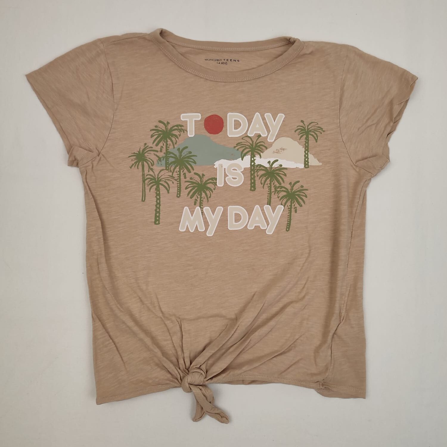 Autres commentaires : T-shirt beige sable à manches courtes, à nouer en bas, col rond, motif oasis et palmiers avec inscription « TODAY IS MY DAY ».