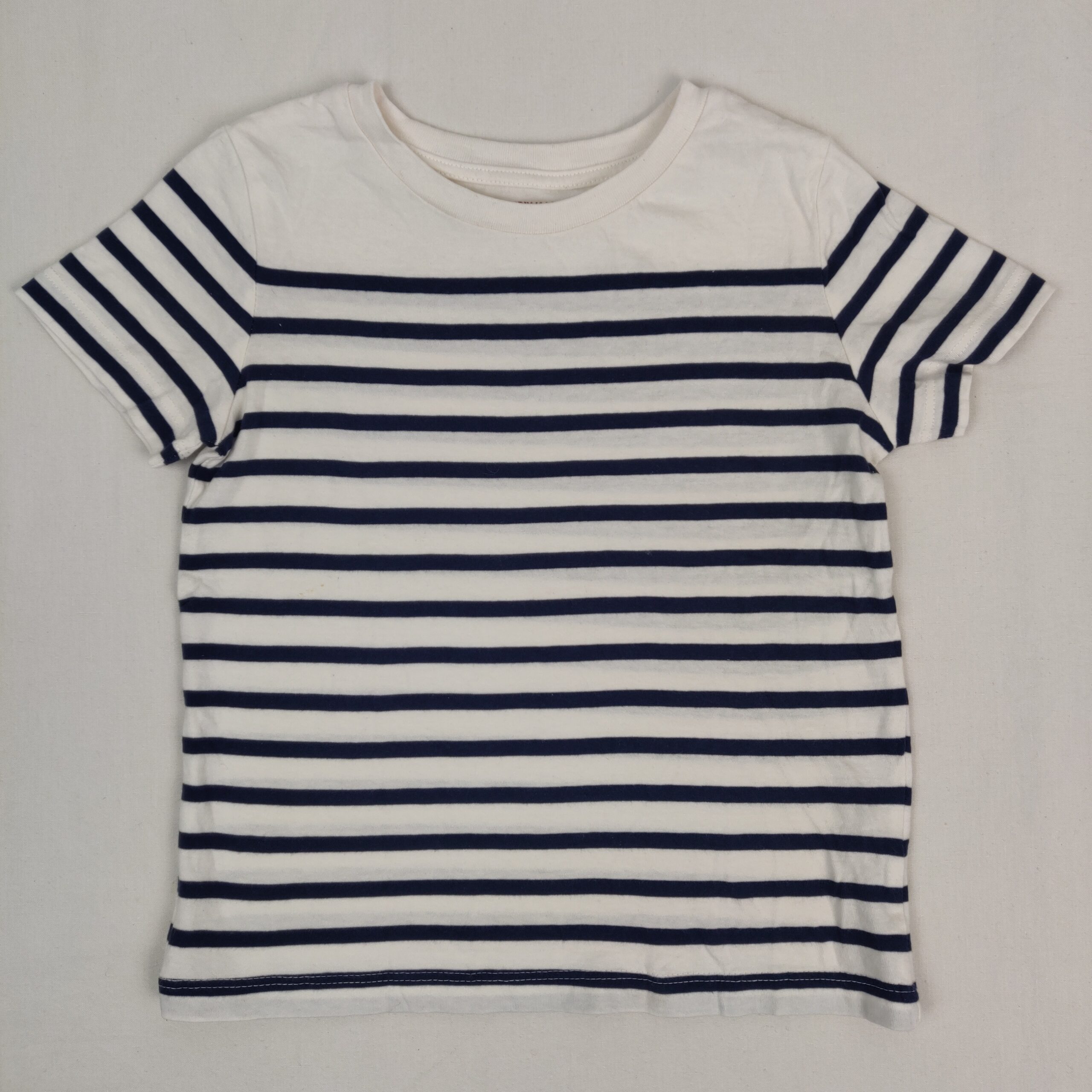 Autres commentaires : T-shirt manches courtes blanc crème à rayures bleu marine style marinière, col rond.