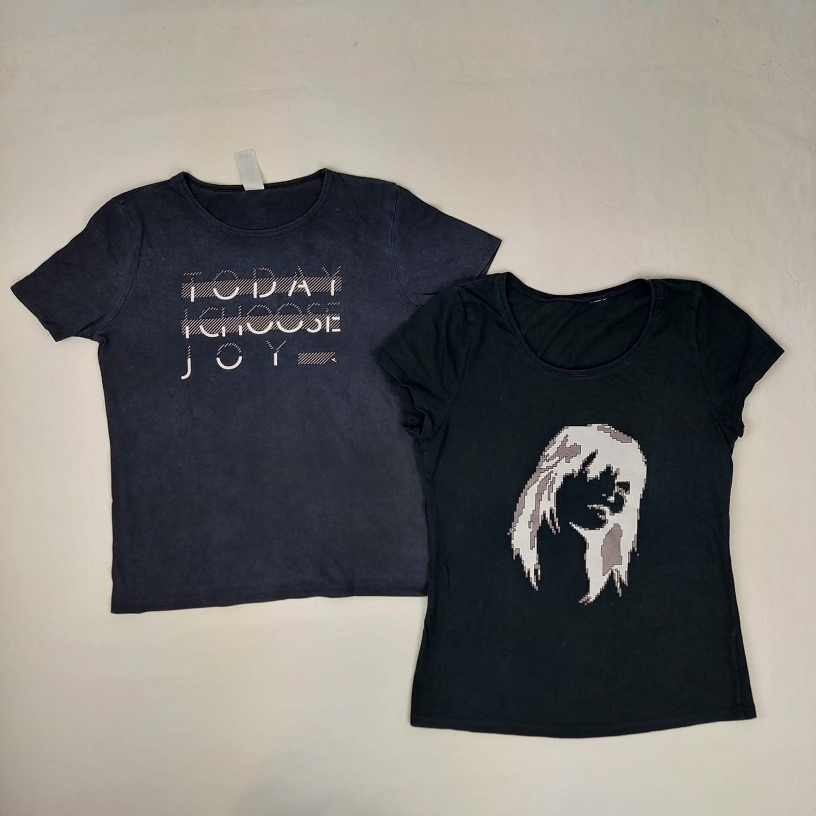 Autres commentaires : Lot 2 t-shirts manches courtes noir, un Decathlon imprimé « TODAY I CHOOSE JOY », un imprimé pixellisé