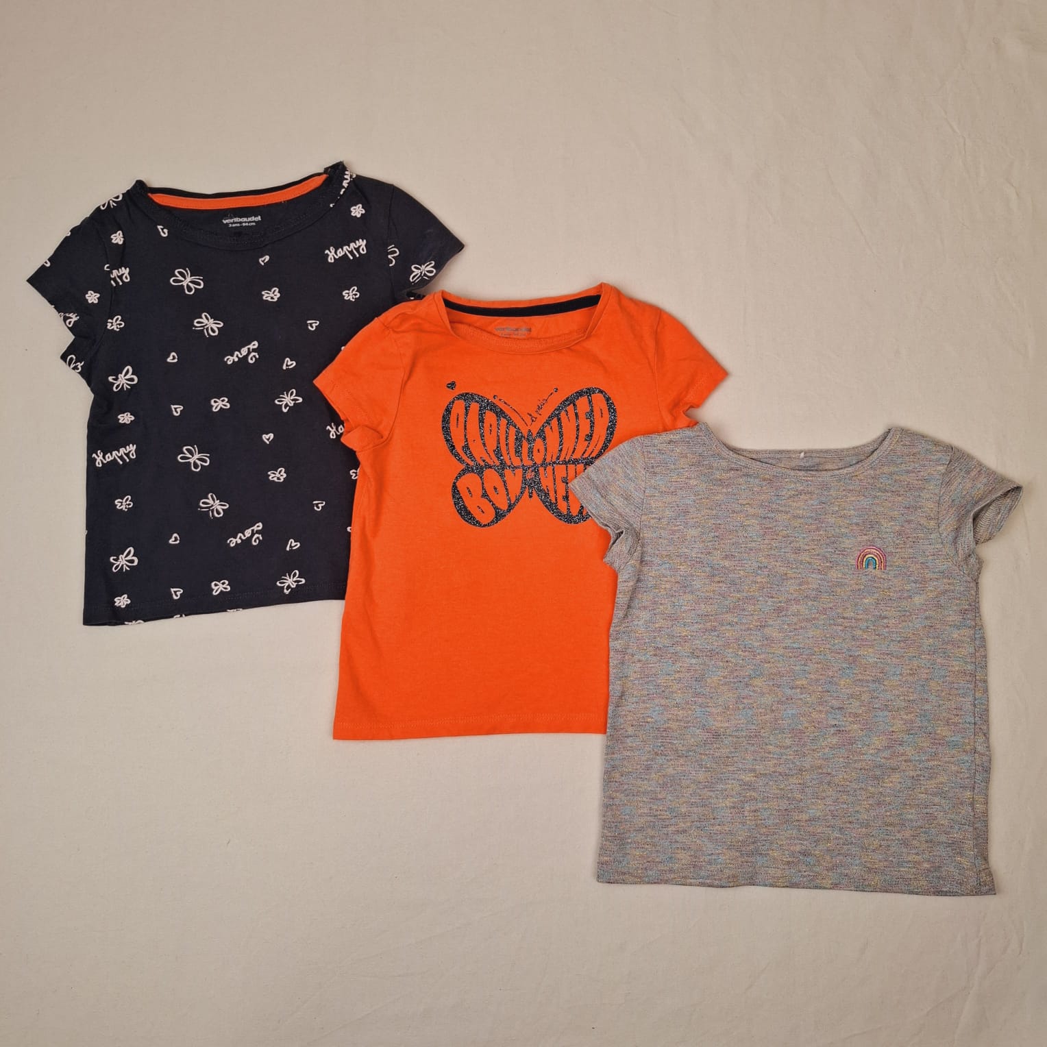 Autres commentaires : Lot de 3 T-shirt à manches courtes, col rond: -Orange uni VERTBAUDET, motif papillon et inscription « Papillonner bon de heur ». -Bleu foncé VERTBAUDET, motif papillons et cœurs avec inscriptions « Happy ». -Gris ZEEMAN avec fil métallique jaune bleu et violet, motif arc-en-ciel, 34% polyester, 15% metal.