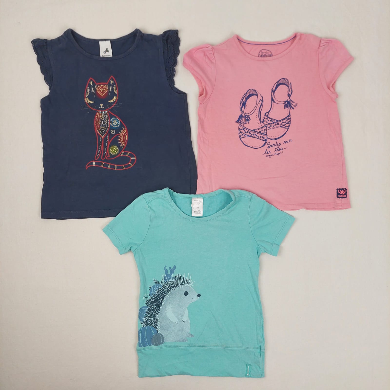 Autres commentaires : Lot de 3 t-shirts manches courtes : T-shirt rose Sergent Major, imprimé sandale, avec un petit défaut (accroc en bas rappiécé), T-shirt bleu foncé Palomino, imprimé chat, T-shirt bleu clair Decathlon imprimé Hérisson