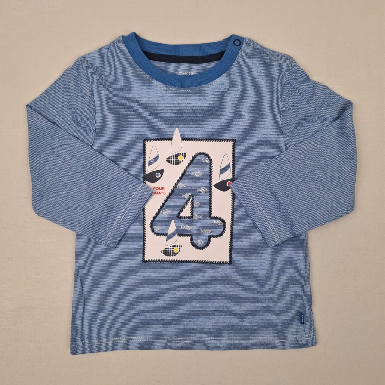 Autres commentaires : T-shirt manches longues, 12 mois, obaïbi, à rayures bleu et blanc tres fines, finitions en bleu, illustration de bateau avec le chiffre 4 à l’avant du vêtement, col rond avec ouverture par boutons pression sur le coté.