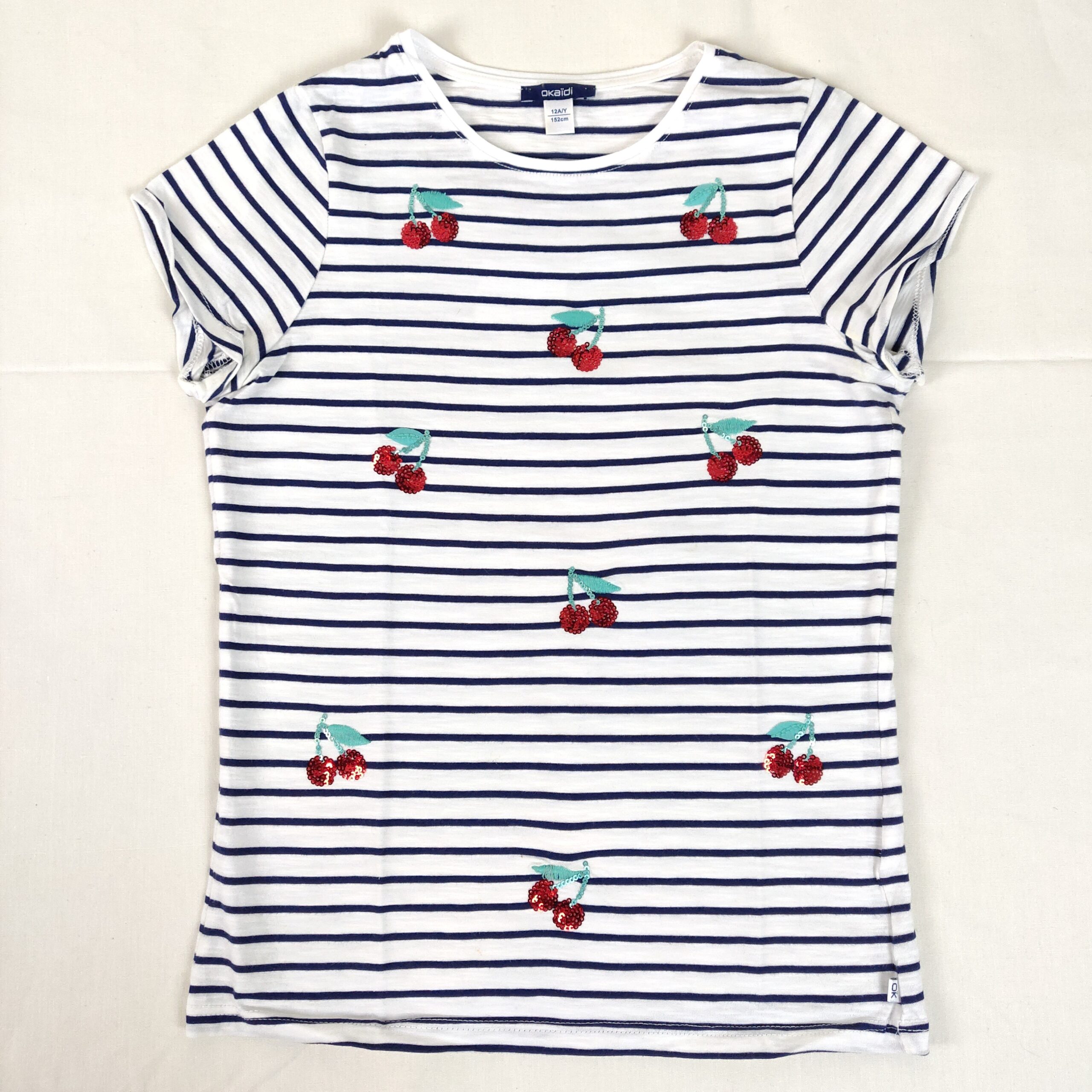 Autres commentaires : T-shirt manches courtes marinière col rond avec cerises en sequins