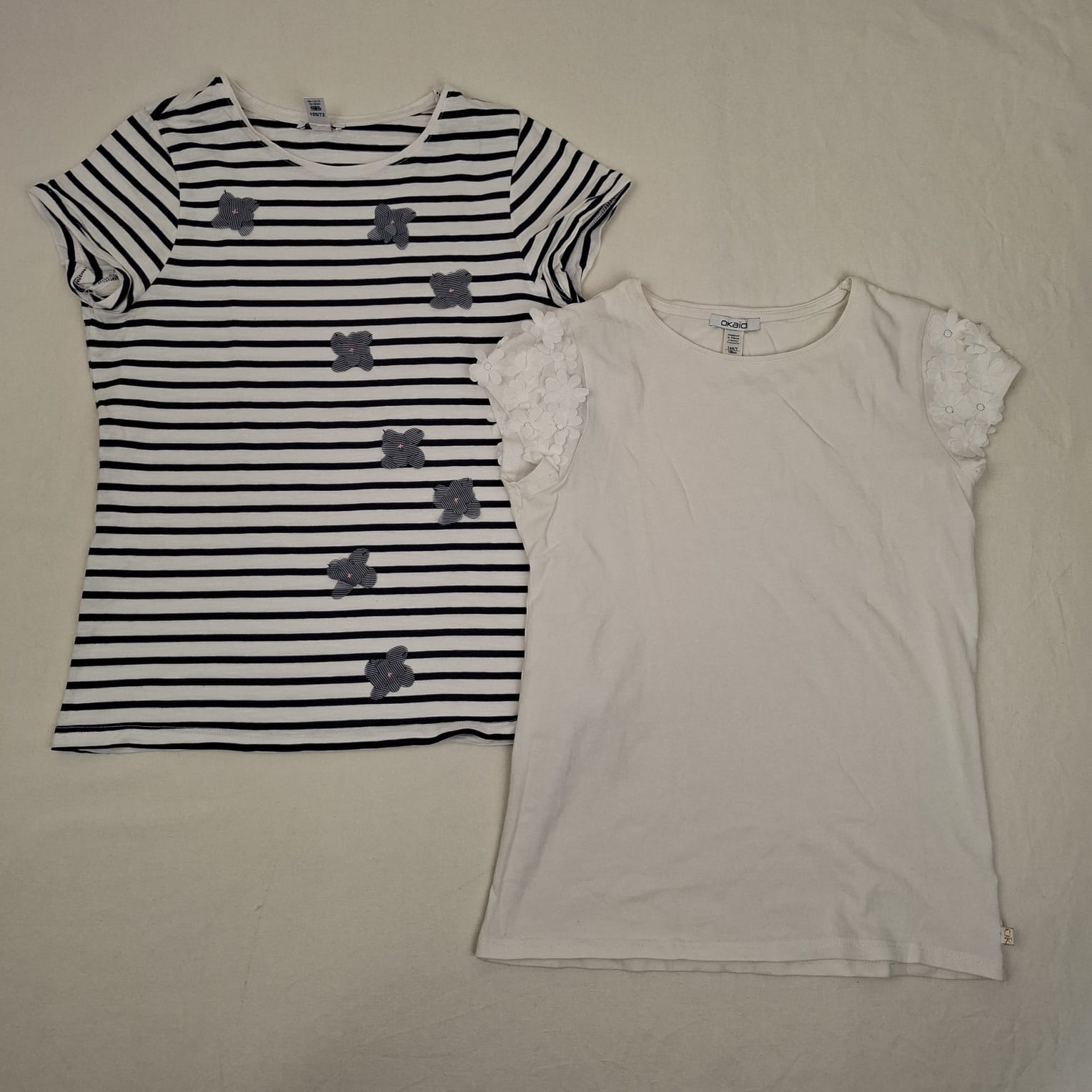 Autres commentaires : Lot de 2 T-shirt à manches courtes, col rond : – Blanc uni, motif fleurs blanc sur les manches. – Blanc à rayures bleues, manches retroussées, motif fleurs devant.