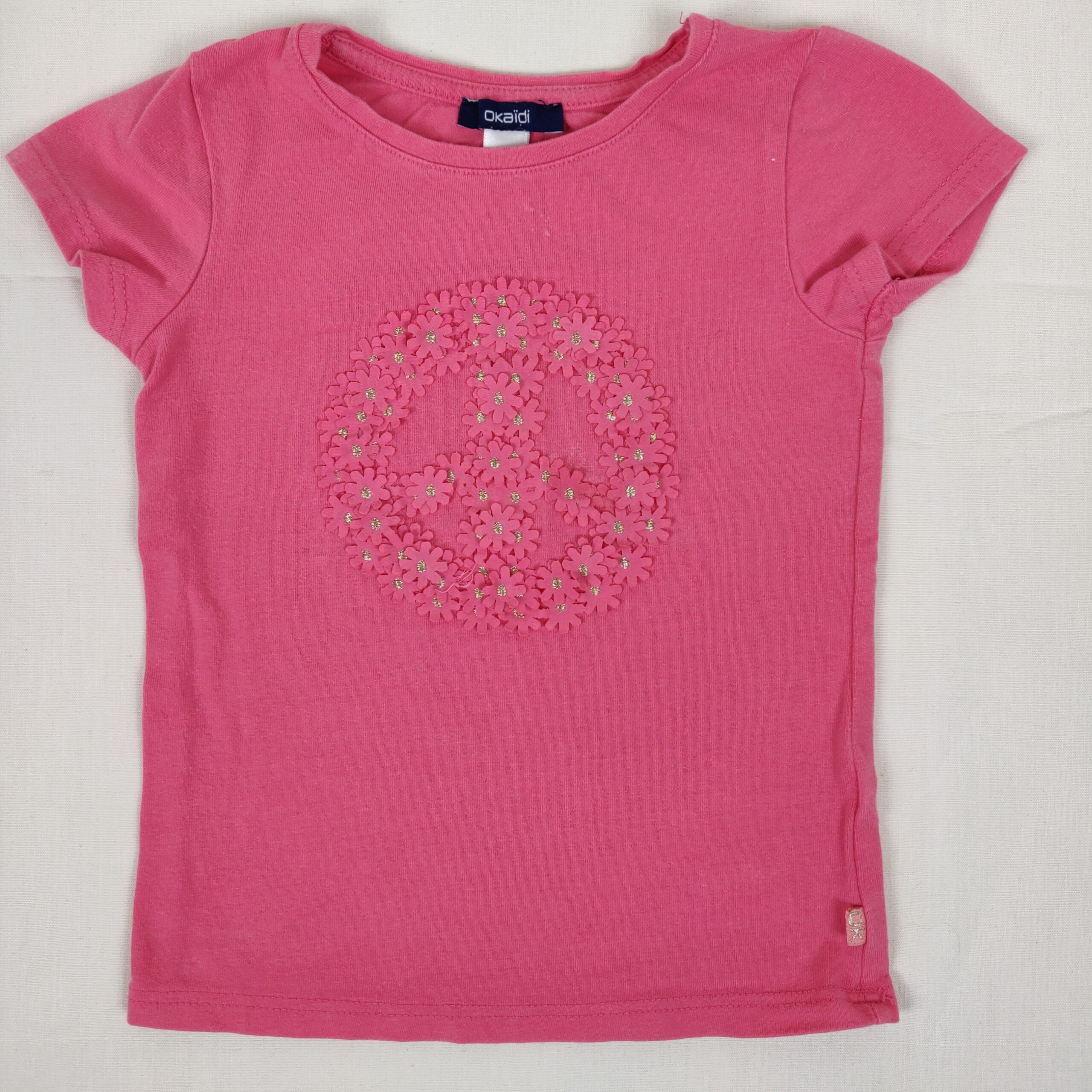 Autres commentaires : T-shirt rose corail, à manches courtes. Motif peace and love formé par des fleurs ton sur ton brodées avec centre doré.