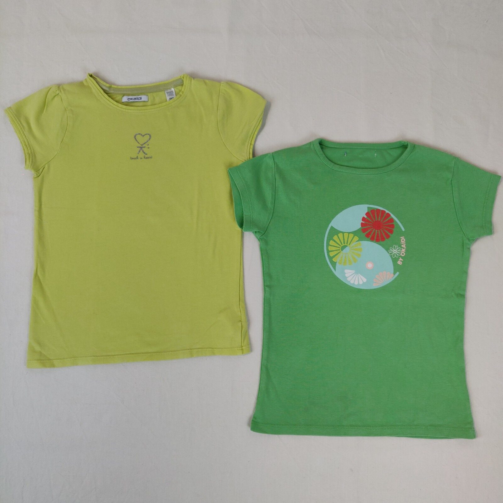 Autres commentaires : 5% élasthanne. Lot de 2 t-shirts à manches courtes. Un t-shirt jaune-vert. Griffe de la marque argentée centrale accompagnée de l’inscription « touch a heart ». Un t-shirt vert. Motifs centraux floraux multicolores.