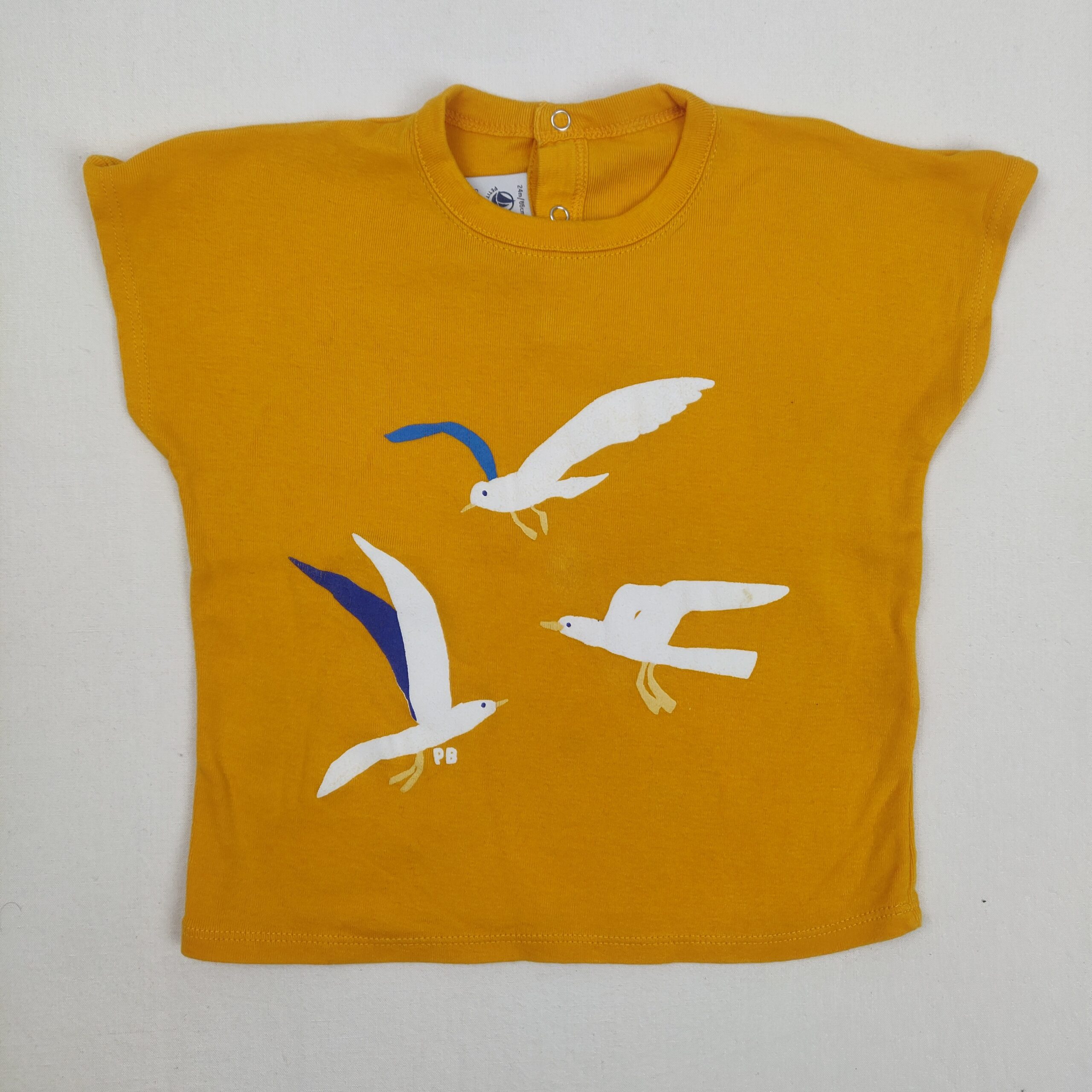 Autres commentaires : T-shirt sans manches motif mouettes, fermeture par boutons pressions au dos. Petite tache beige sur l’aile d’une des mouettes, niveau réduit de Fraise à Myrtille.