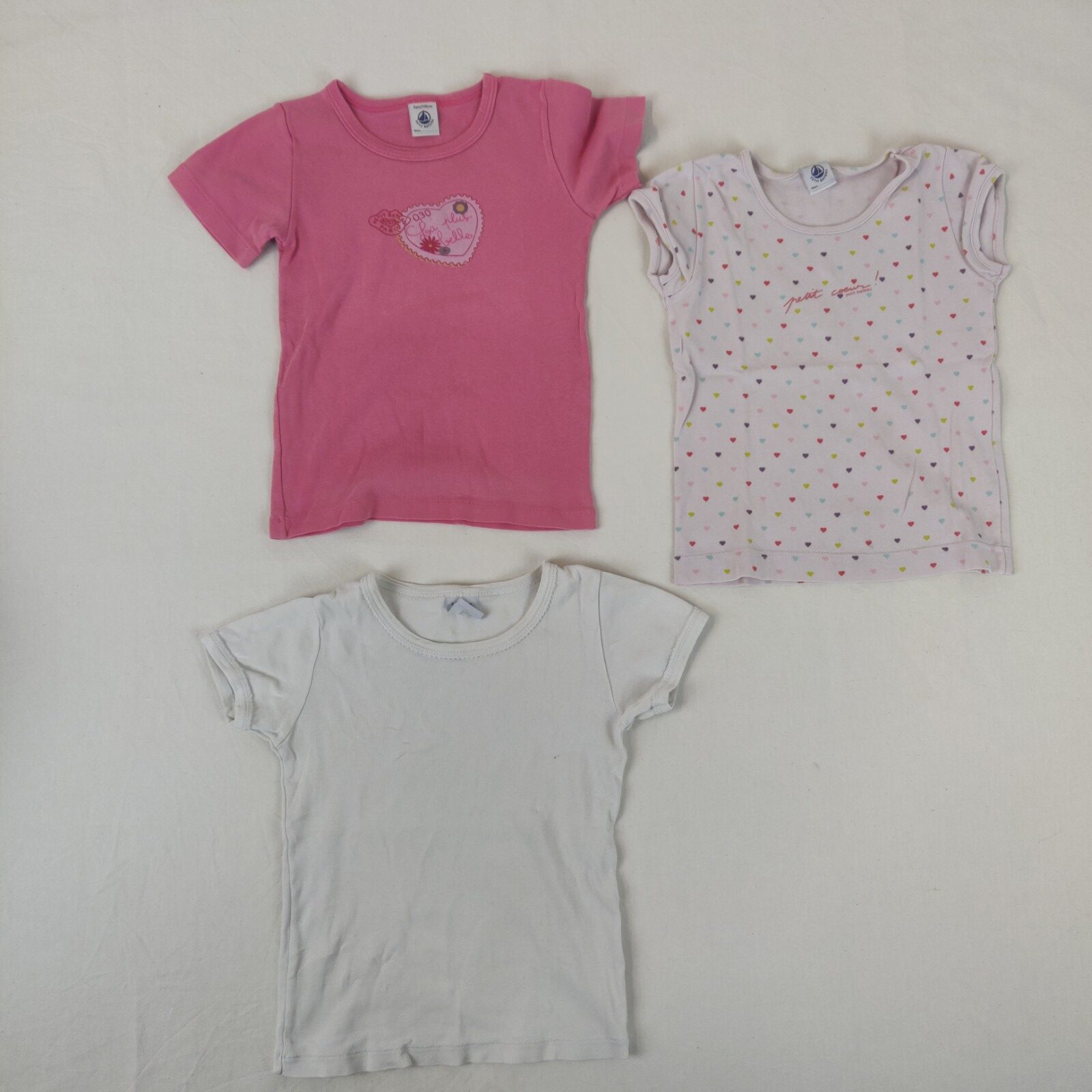 Autres commentaires : Lot de 2 t-shirts à manches courtes. Un t-shirt rose. Motif central coeur accompagné de l’inscription « La plus belle ». Un t-shirt – blanc. Motifs coeurs multicolores. Inscription centrale rouge « Petit coeur! ». Un t-shirt blanc Petit Bateau offert avec une tâche marron.