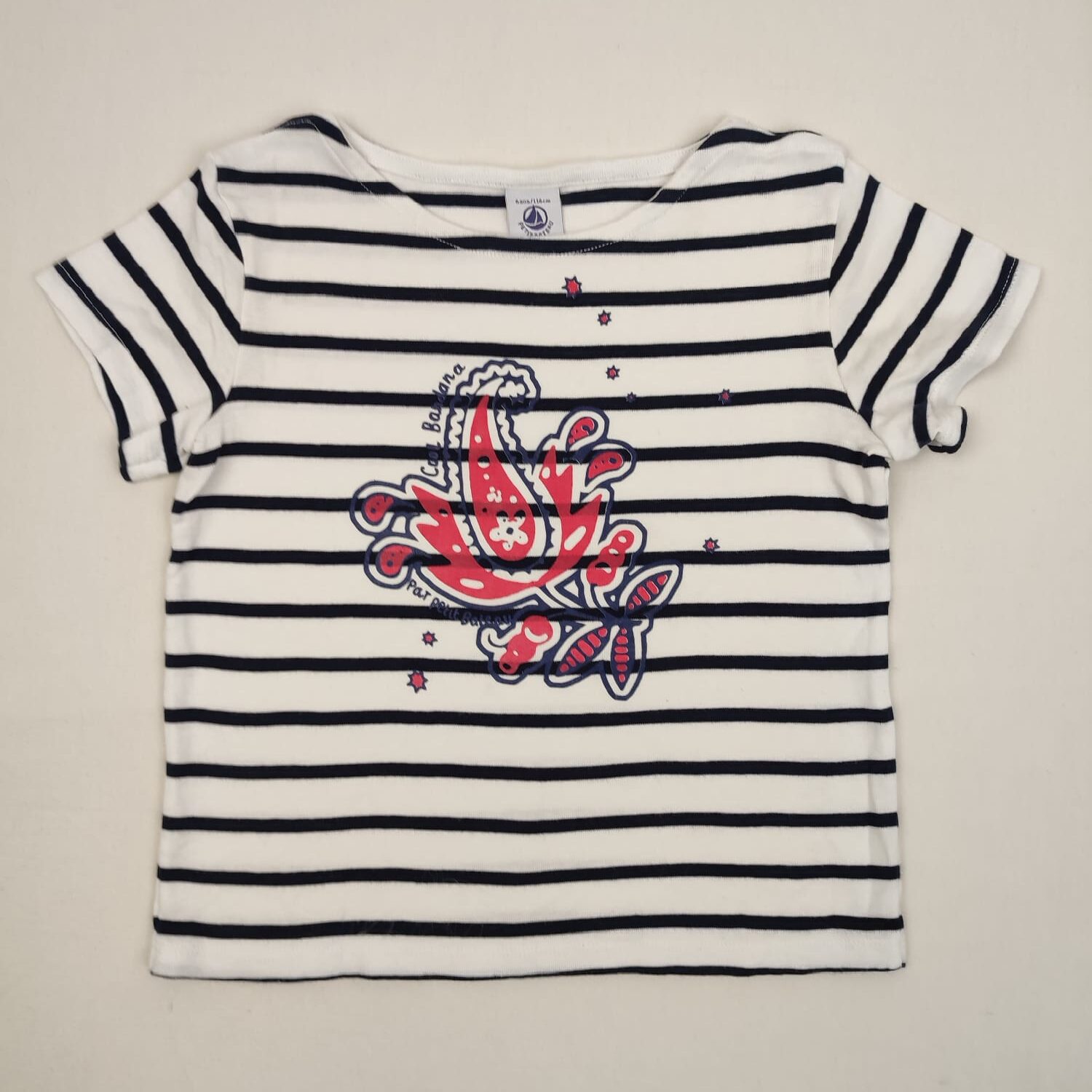 Autres commentaires : T-shirt blanc à manches courtes avec rayures noires, motif grosse fleur rouge, col bateau, collection Bandana.