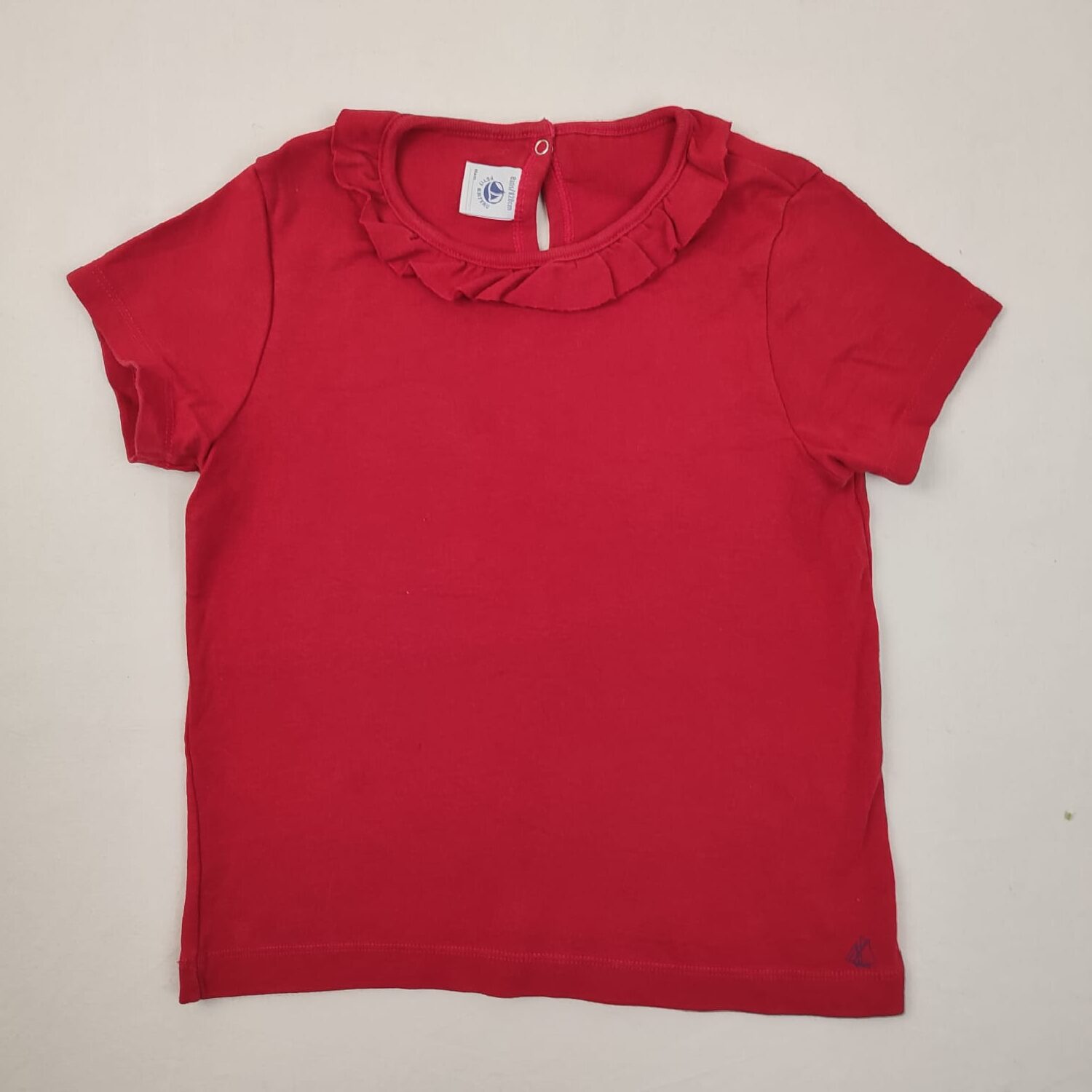 Autres commentaires : T-shirt rouge à manches courtes, col collerette, fermeture par un bouton pression en haut du dos. Etat : micro tache sur le devant. Niveau réduit de Fraise à Myrtille.