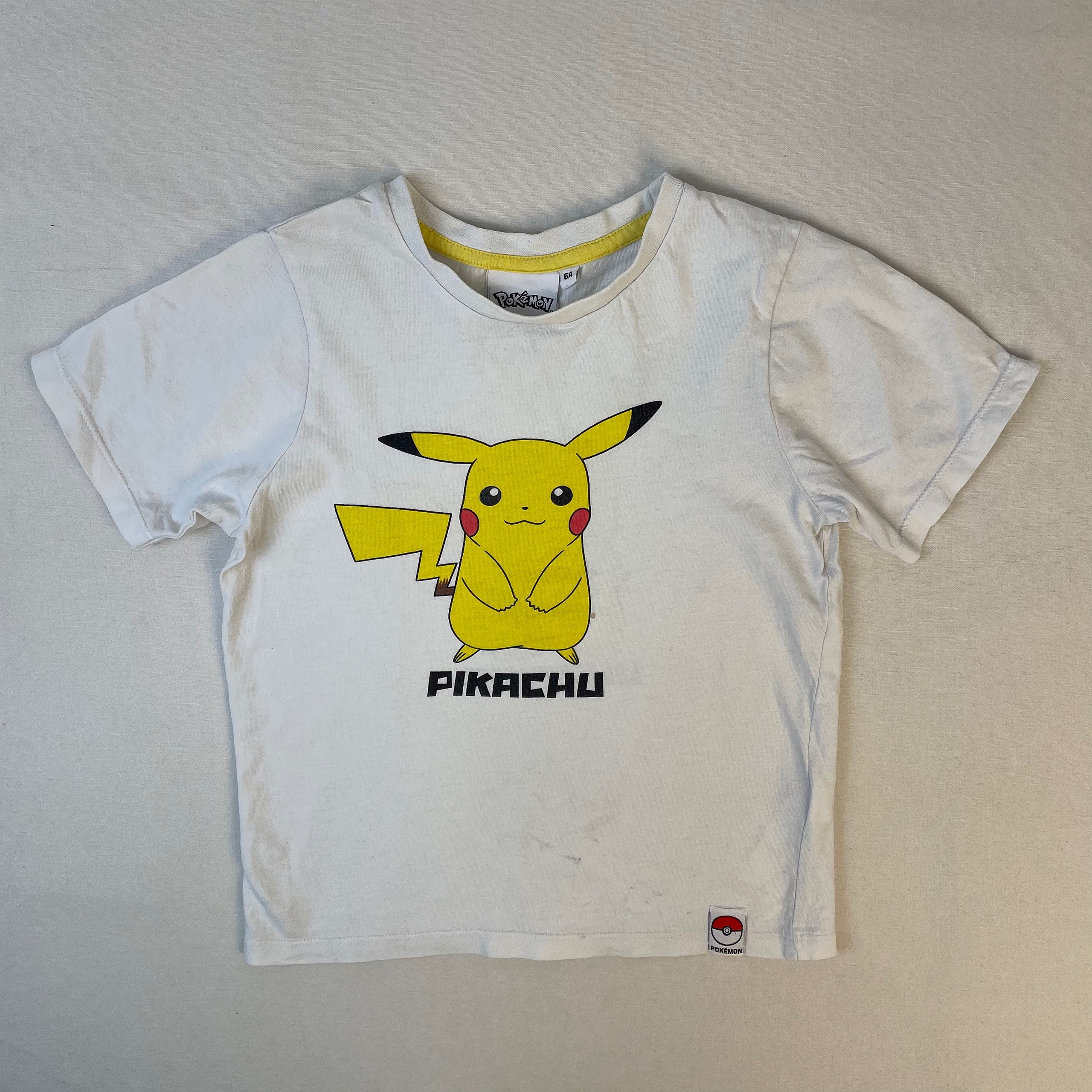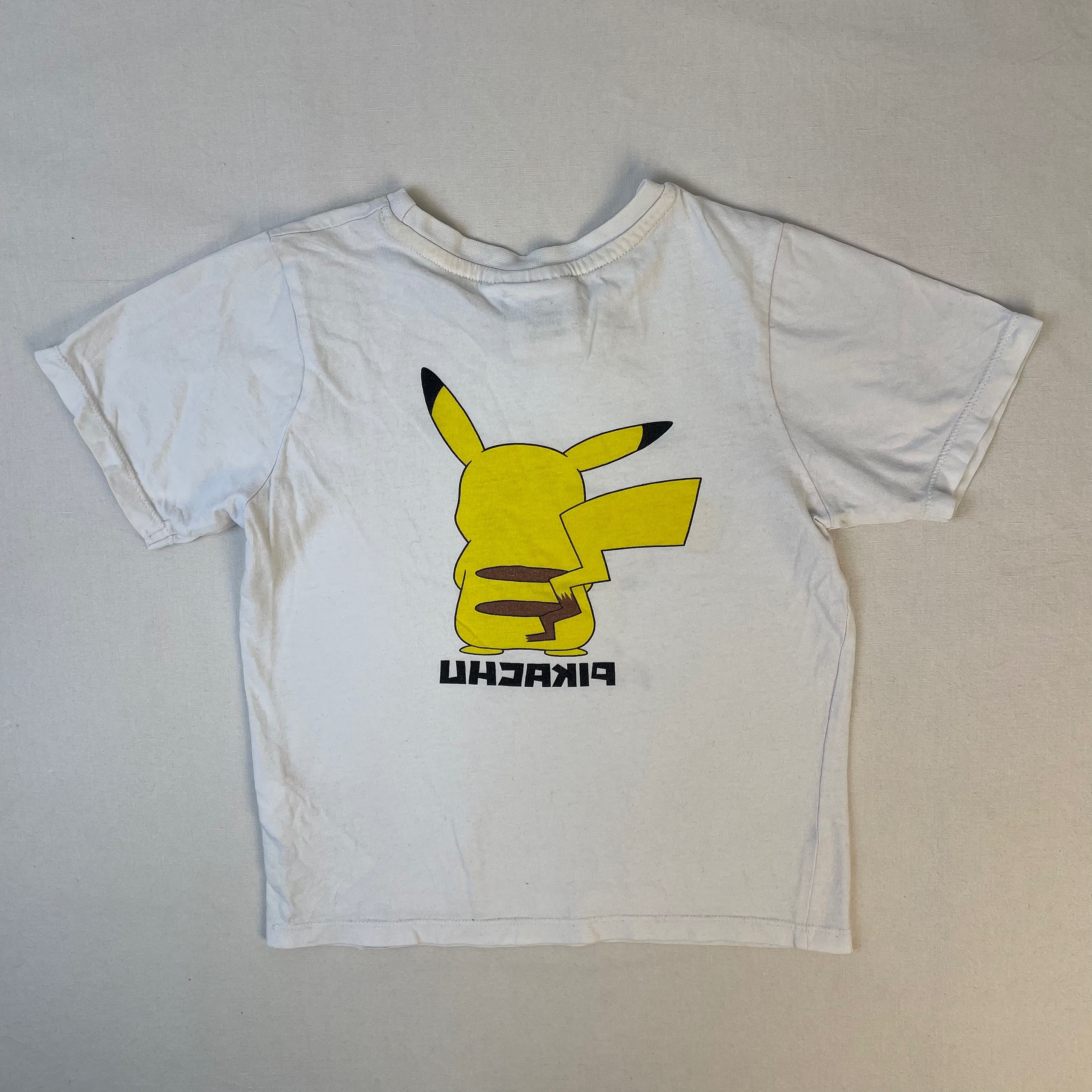 - T-shirt Pokemon blanc avec pikachu de face au devant de vêtement et sur le dos pikachu de dos. Petit défaut, minuscule tâche à coté de la jambe gauche de pikachu. Niveau réduit de Myrtille 2 à 1.