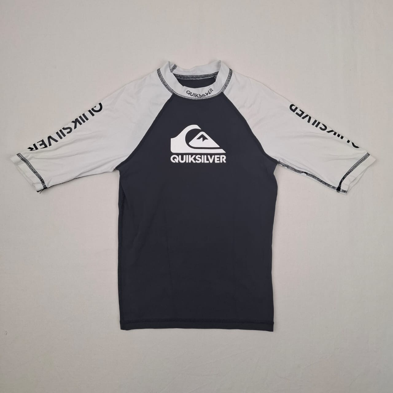 Autres commentaires : T-shirt manches longues, Quiksilver, 8 ans, on retrouve à l’avant du vêtement le logo Quiksikver floqué, l’insccription « Quiksilver » est floqué sur les bras et le col, celui ci est légèrement effacé sur le col.