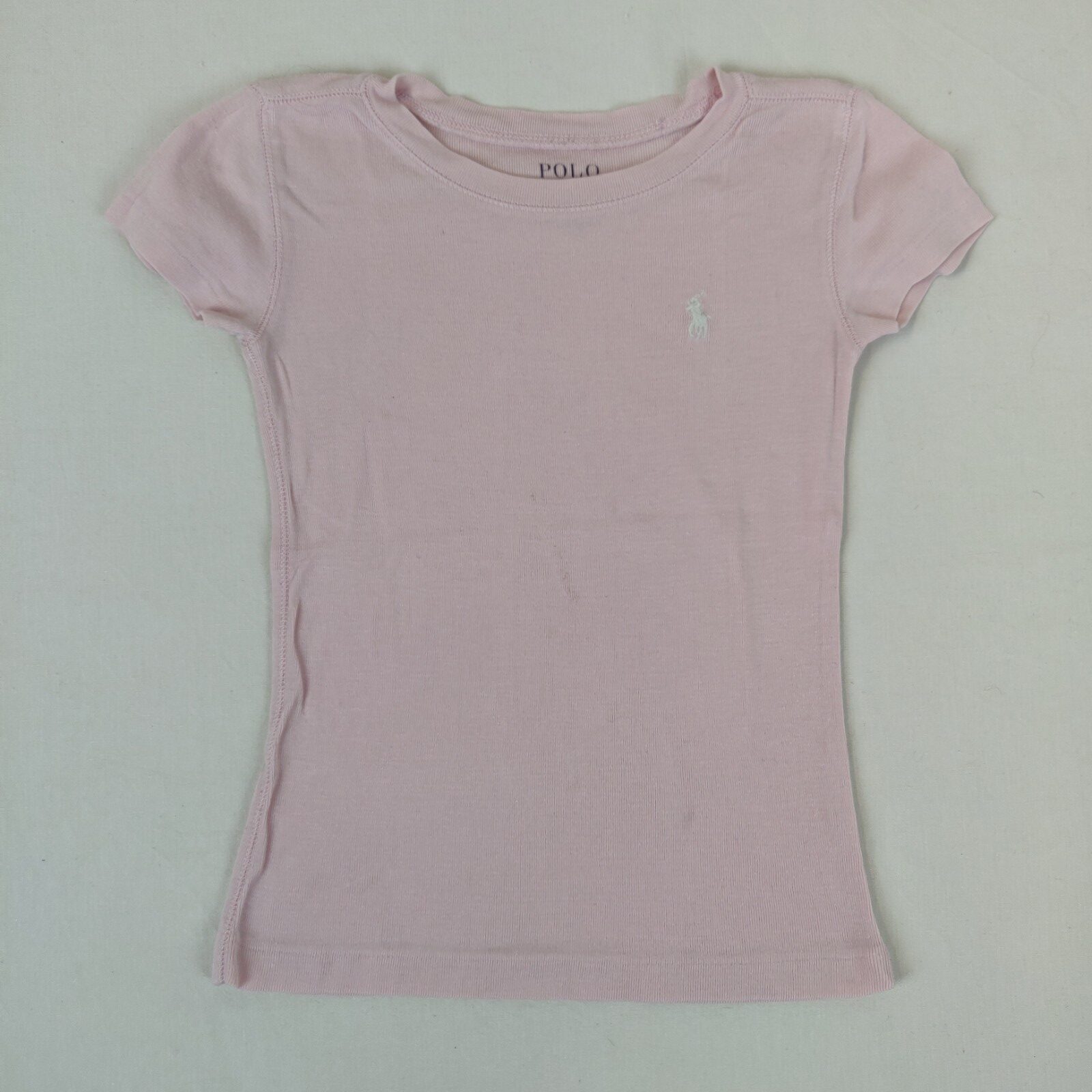 Autres commentaires : T-shirt à manches courtes – rose. Joueur de polo blanc central, griffe de la marque. Quelques tâches marrons discrètes. Niveau réduit de fraise à myrtille.