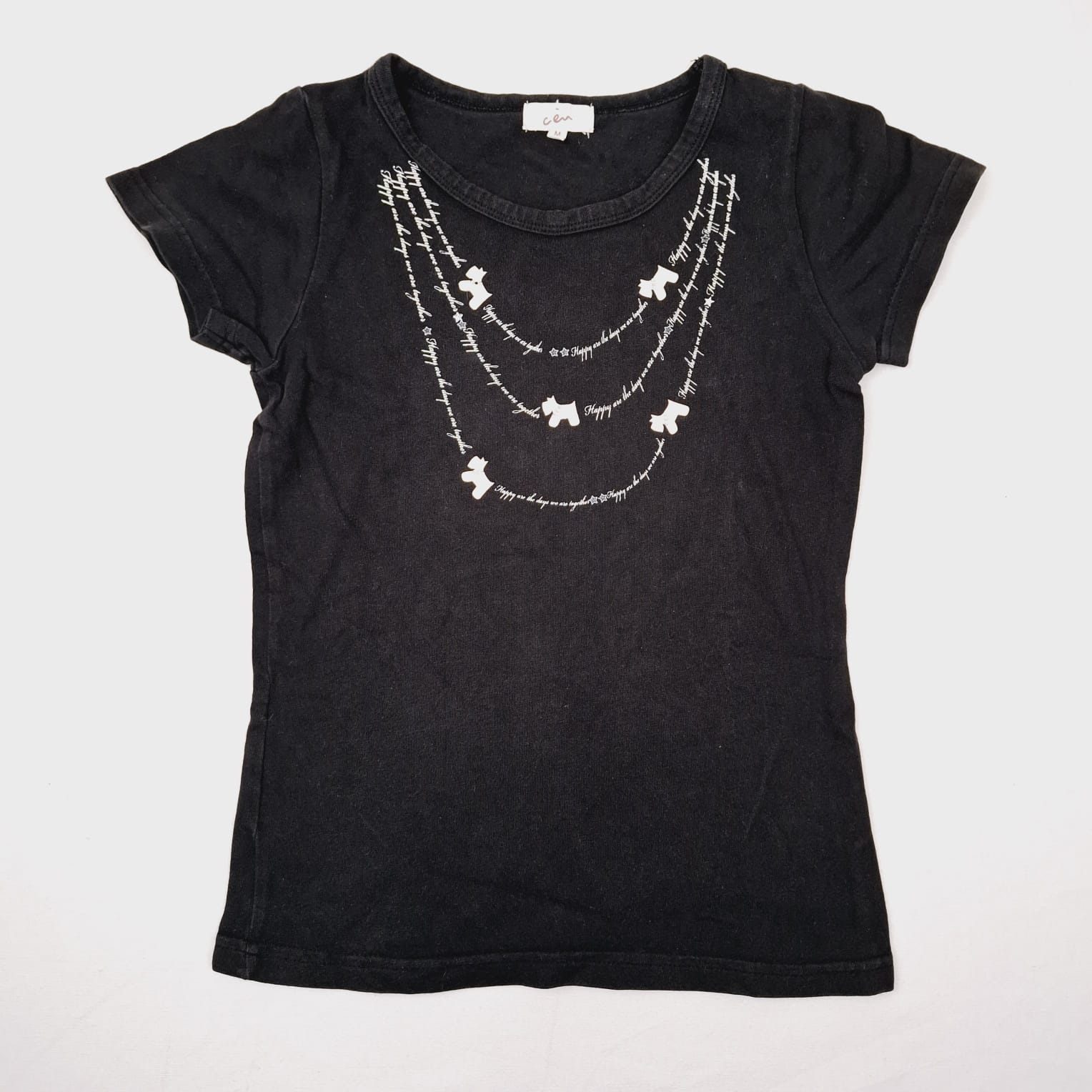 Autres commentaires : T-shirt noir à manches courtes, imprimé sautoirs avec strass argentés, col rond.
