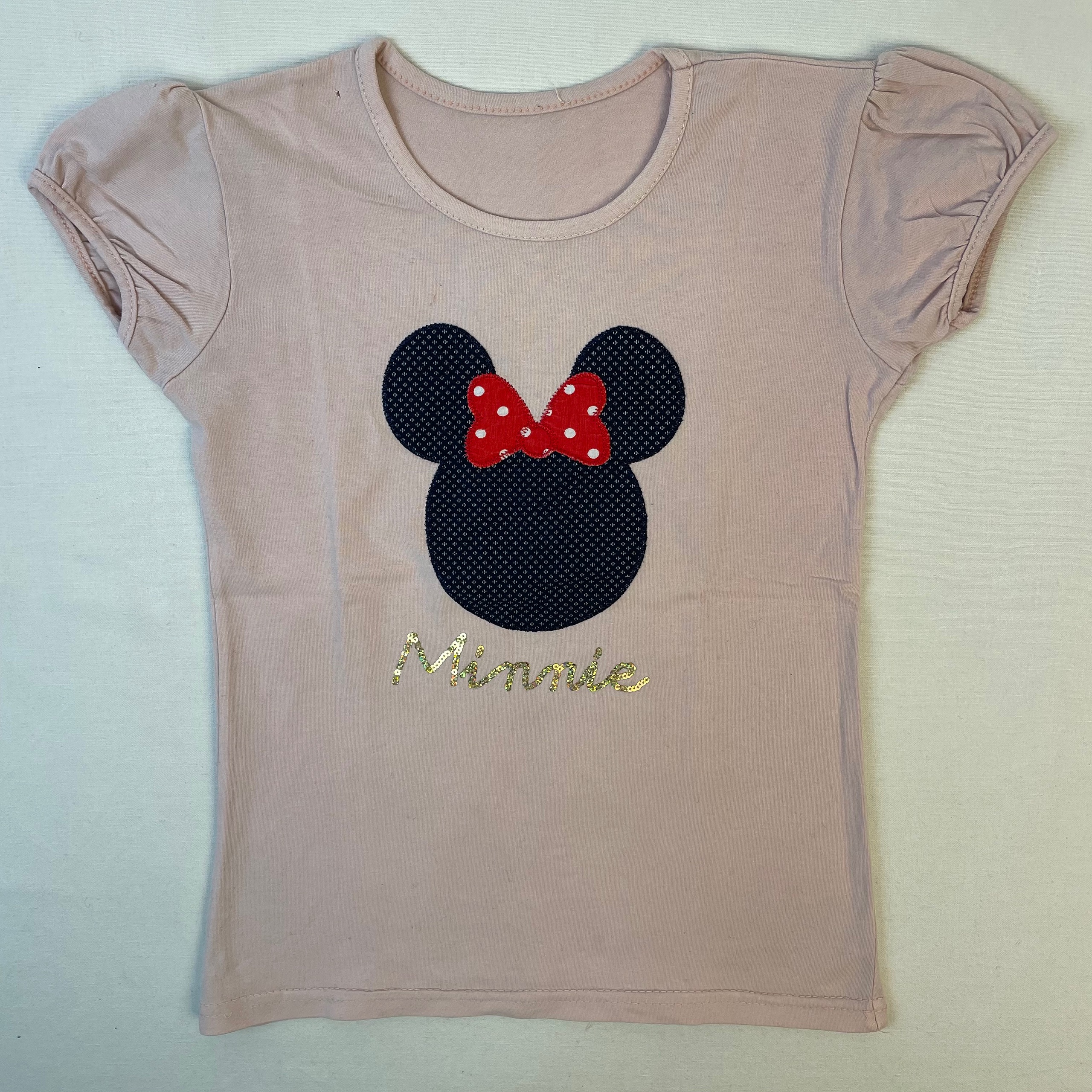 - T-shirt rose pâle, col rond, taille environ 6 ans, motif Mickey Mouse et inscription dorée « Minnie », bouloches.