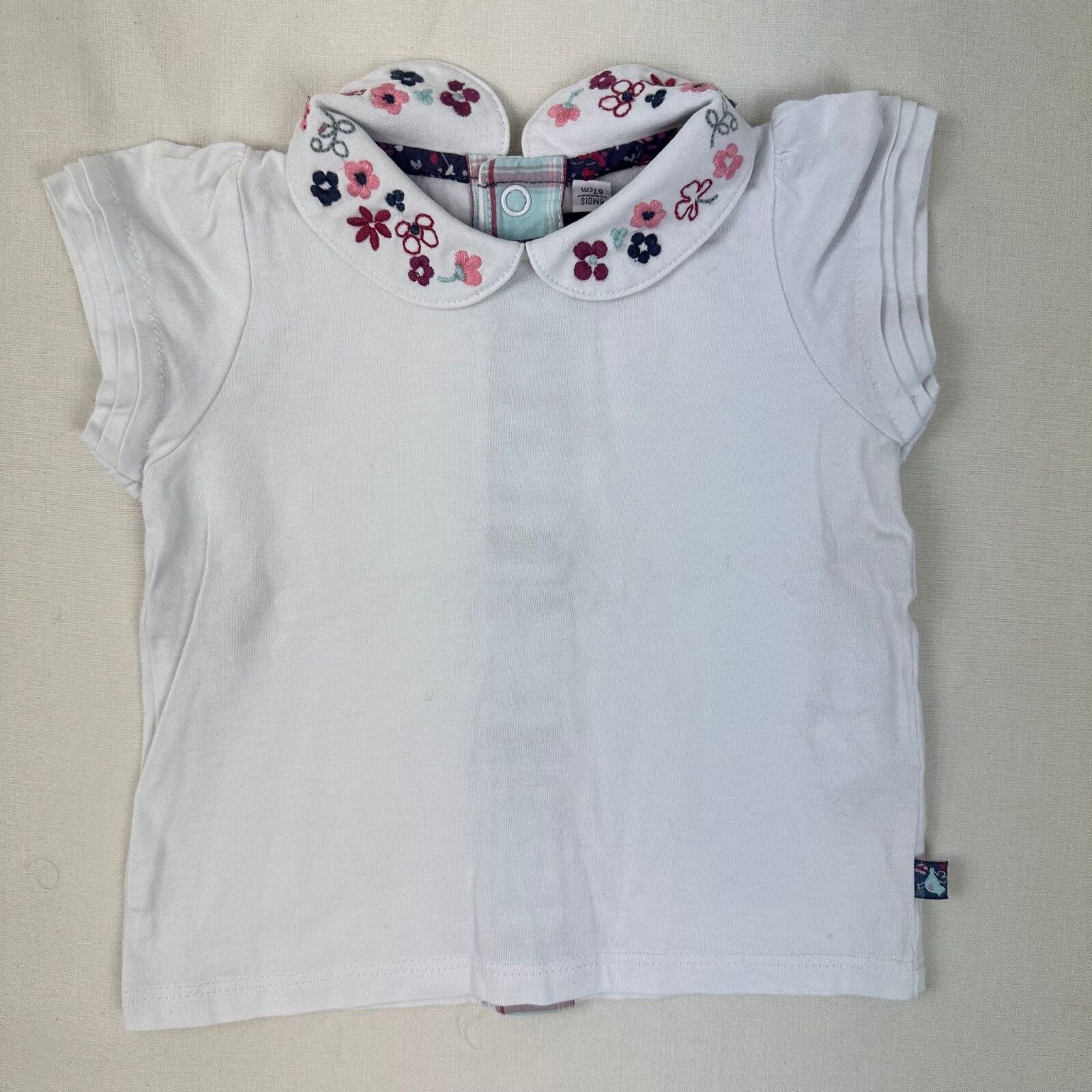 Autres commentaires : T-shirt manches courtes blanches, col claudine avec une fermeture au dos par boutons pressions.