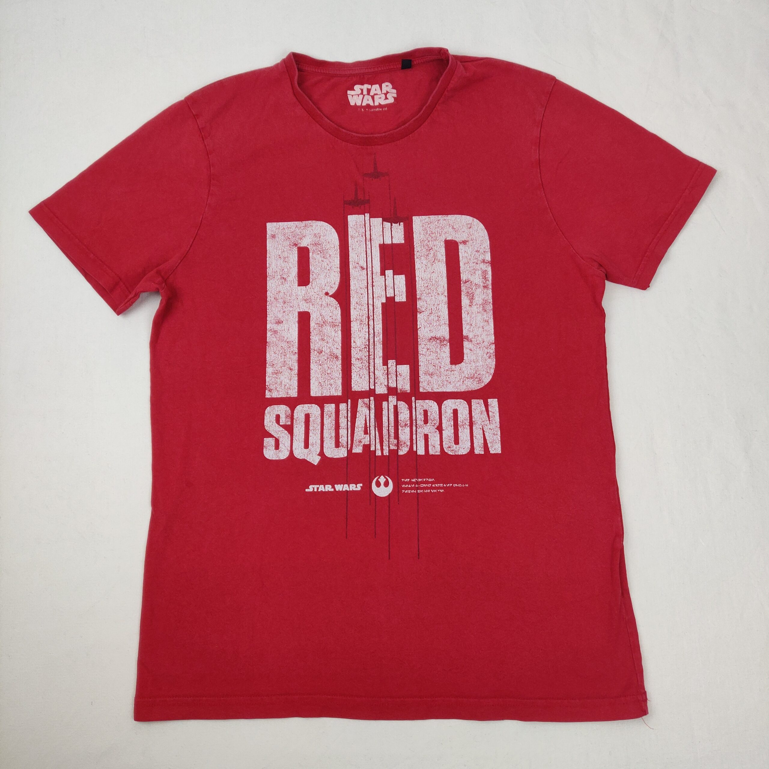 Autres commentaires : T-shirt rouge à manches courtes , col rond, avec inscription en blanc RED SQUADRON, taille L .