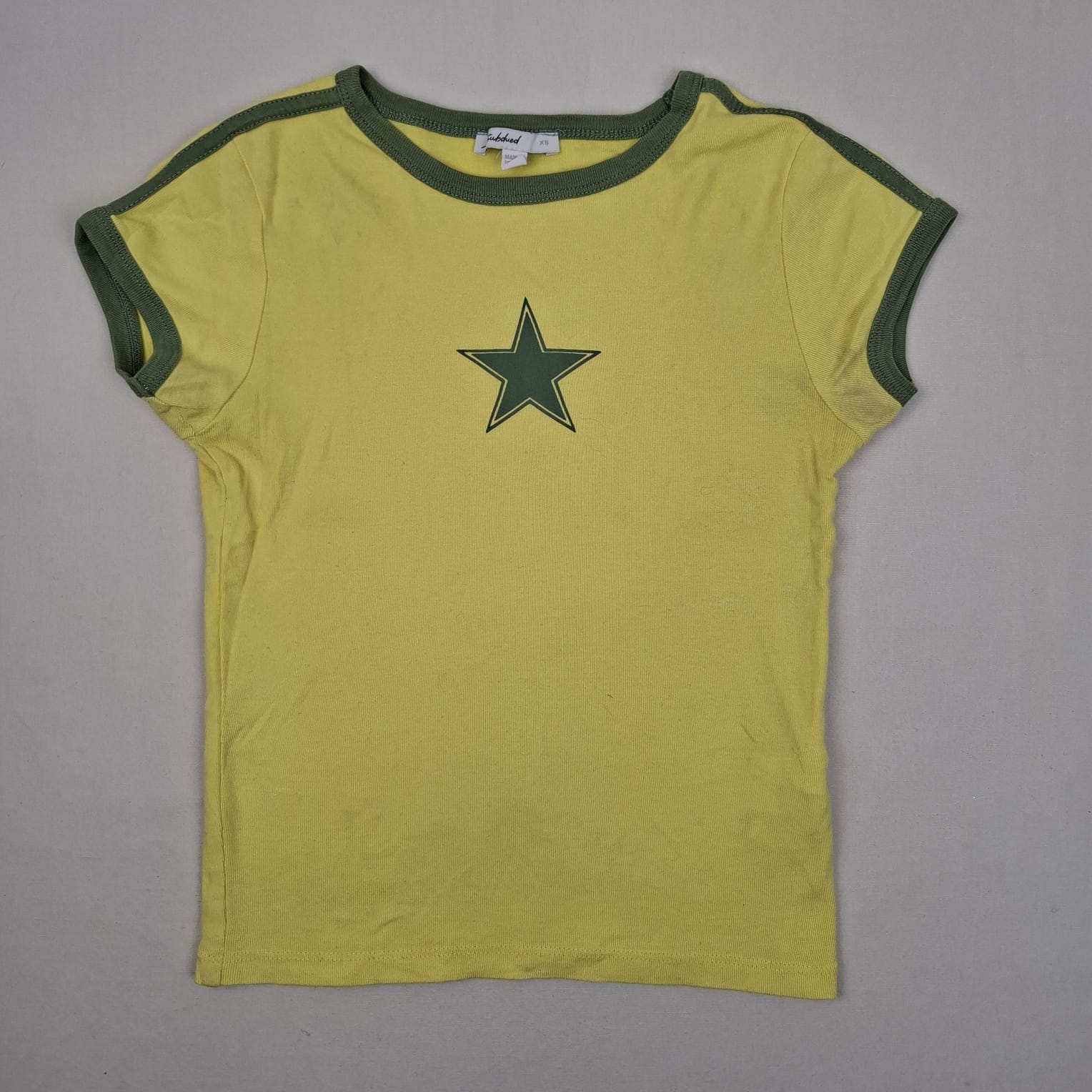 Autres commentaires : T-shirt côtelé jaune-vert à manches courtes, motif étoile, bords côtelés verts, col rond, taille XS.