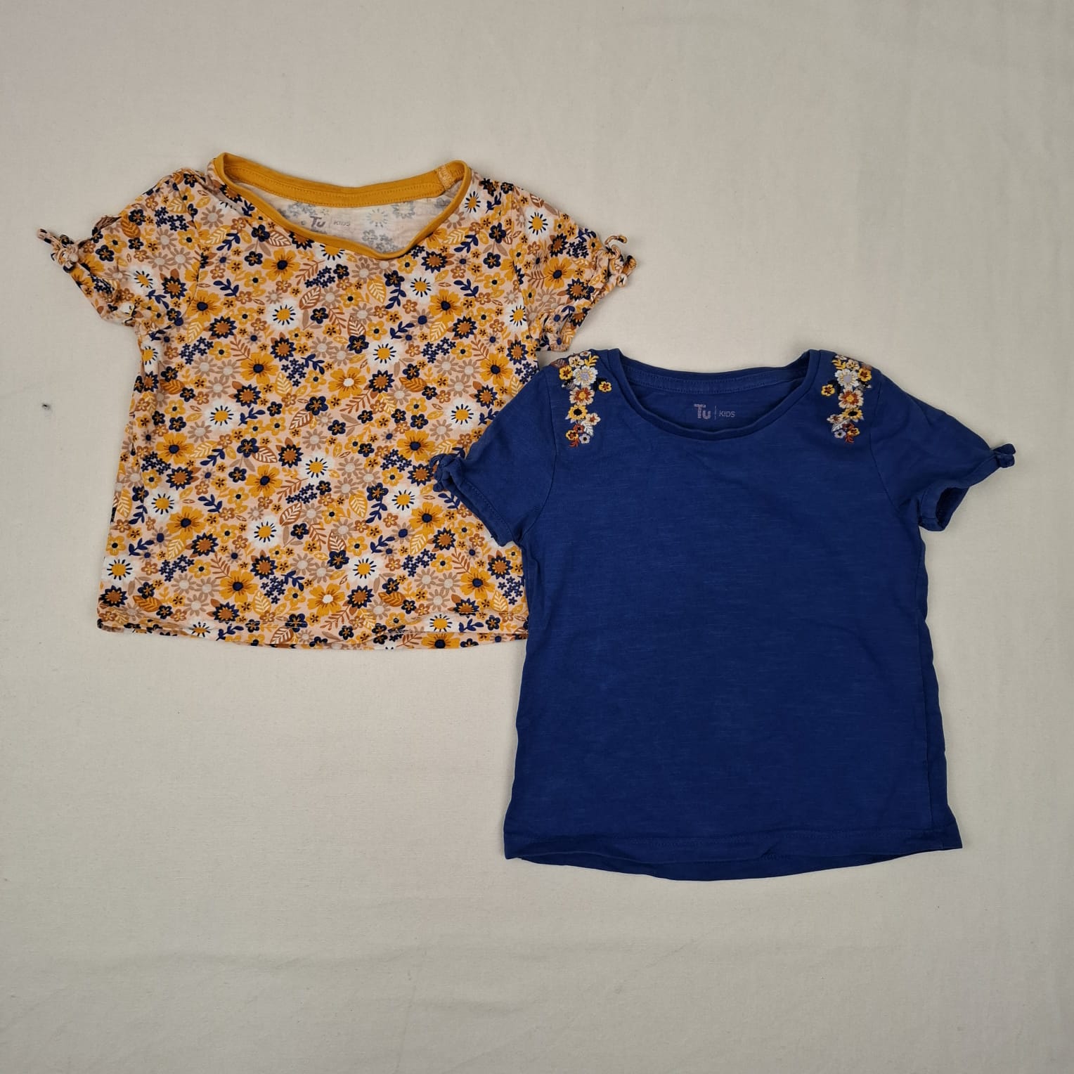 Autres commentaires : Lot de 2 t-shirts manches courtes dendues au dessus et avec petit noeud sur le bord des manches, col arrondi : – Un bleu roi avec broderies jaunes, blanches et marron, devant au niveau des épaules. – un beige rosé, imprimé de fleurs jaunes, bleues, blanches et marron.