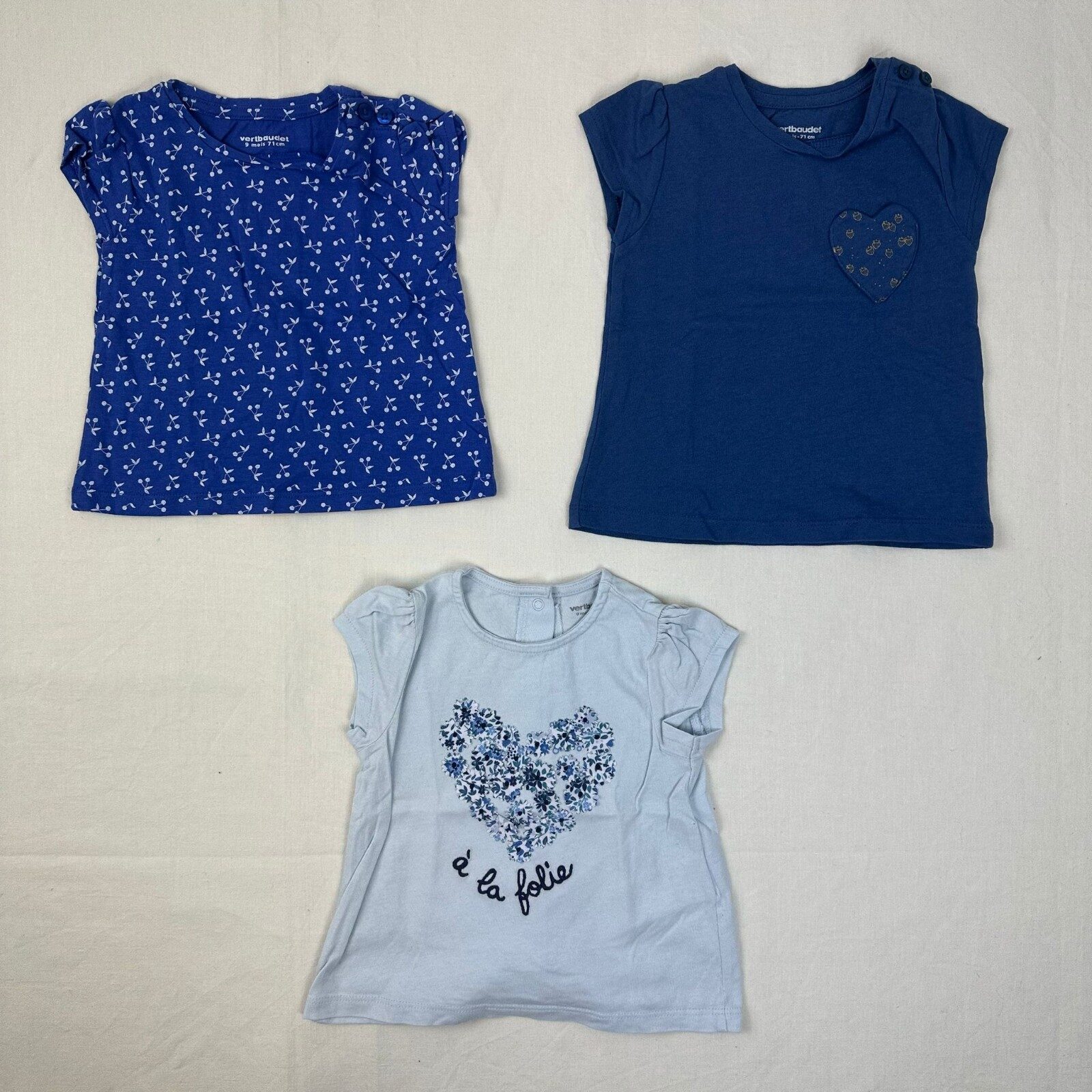 Autres commentaires : 3 t-shirts manches courtes bleu avec une fermeture à l’épaule par boutons.