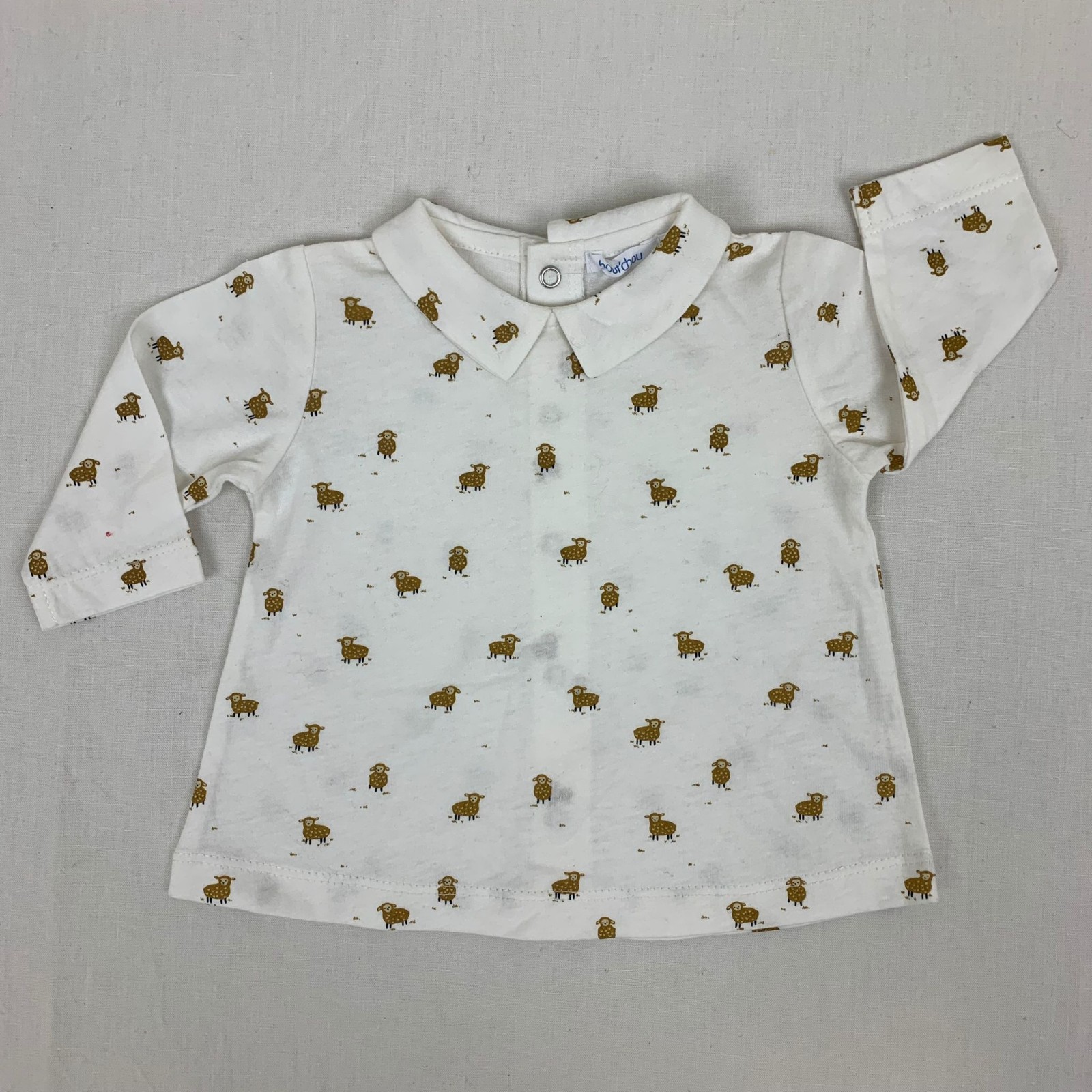 Autres commentaires : T-shirt blanc manches longues avec col claudine et fermeture au dos par bouton pression.
