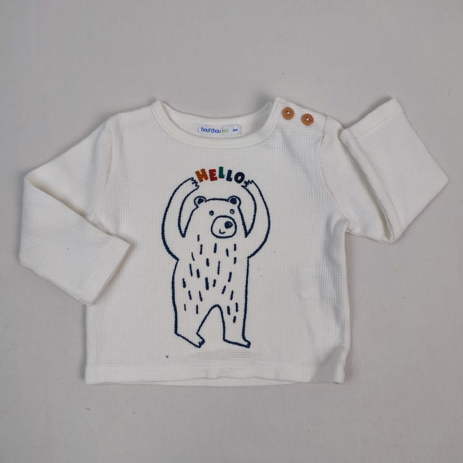 Autres commentaires : T-shirt blanc crème à manches longues, tissu nid d’abeille, motif ours bleu foncé devant avec inscription « Hello », col rond, fermeture par petits boutons sur l’épaule gauche.