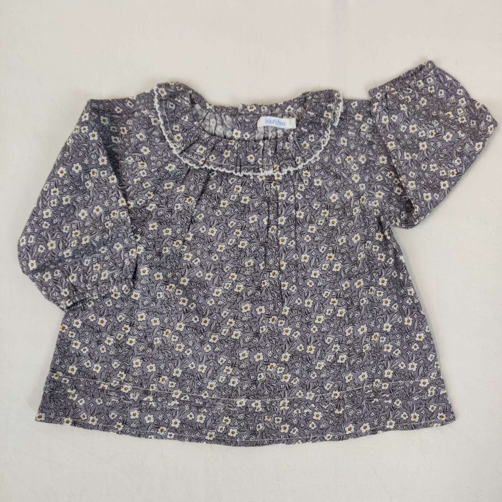 Autres commentaires : T-shirt manches longues violet en liberty avec col collerette et une fermeture par boutons au dos.