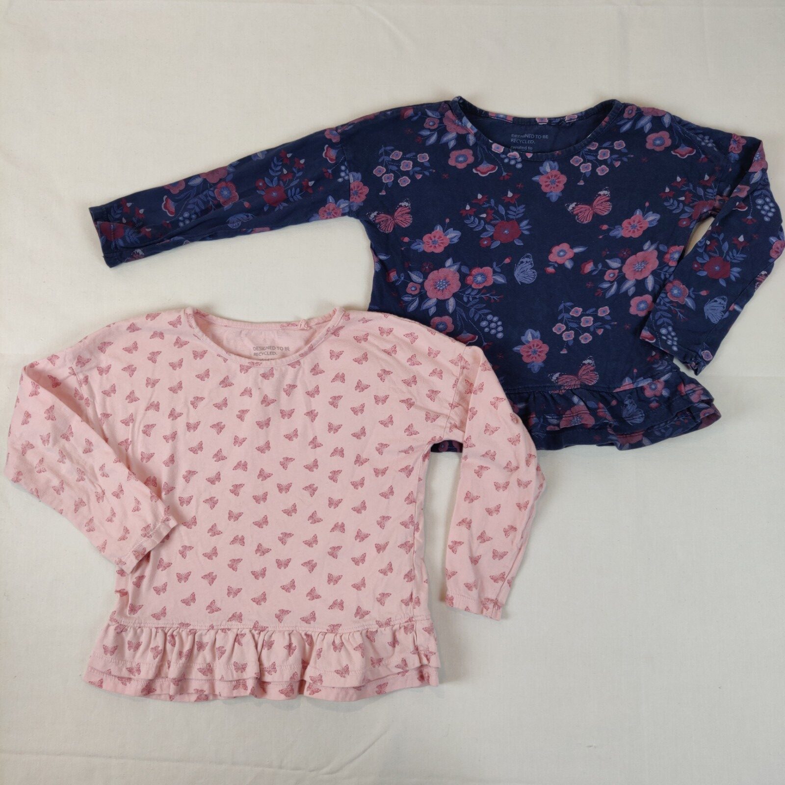 Autres commentaires : Lot de 2 t-shirts manches longues avec deux volants finissant les vêtements. Un t-shirt bleu avec motifs floraux roses et parmes. Un t-shirt rose et motifs papillons prunes. Très léger effet pelucheux.