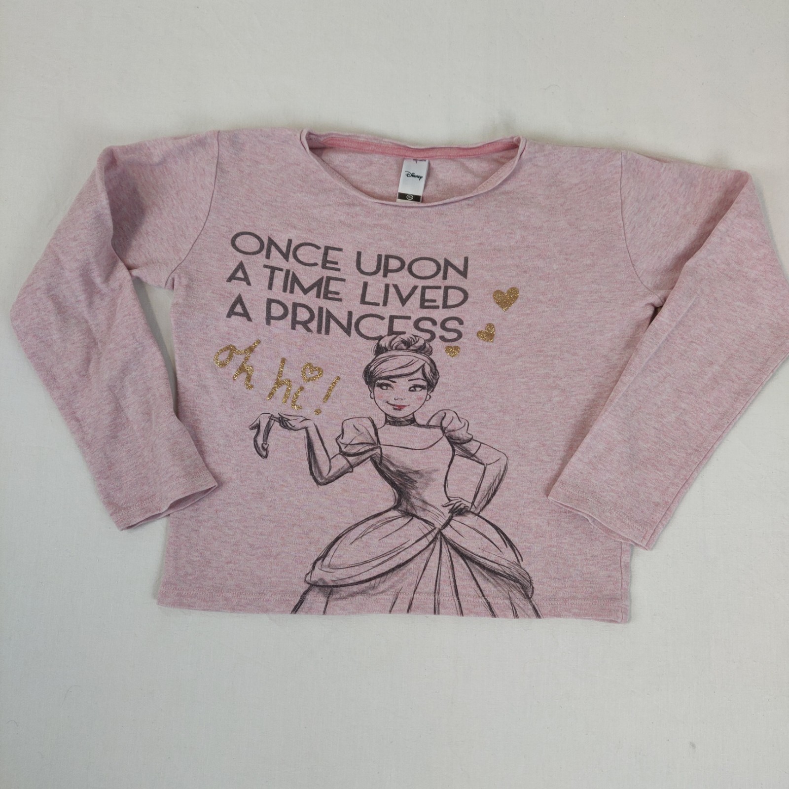 Autres commentaires : T-shirt à manches longues – rose chiné avec motif central princesse accompagné de l’inscription « Once upon a time lived a princess. » Usure normale.