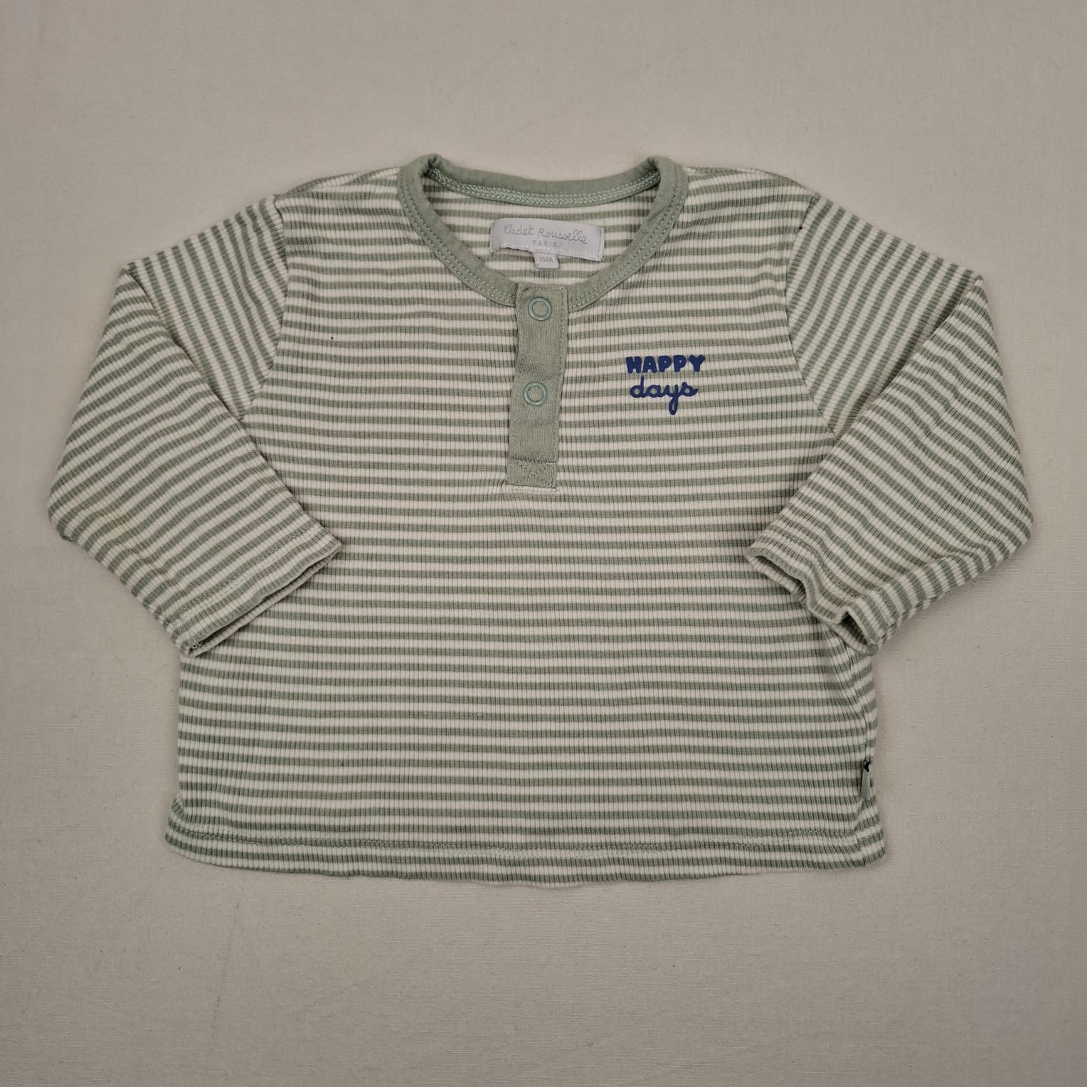 Autres commentaires : 3% élasthanne. T-shirt à rayures blanches et vert gris clair à manches longues, inscription « Happy days », col rond, fermeture par boutons pression.