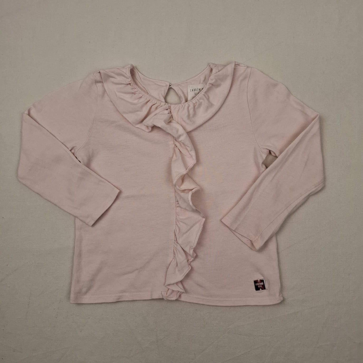 Autres commentaires : T-shirt rose clair à manches longues, col Claudine, fermeture par bouton ou dos.