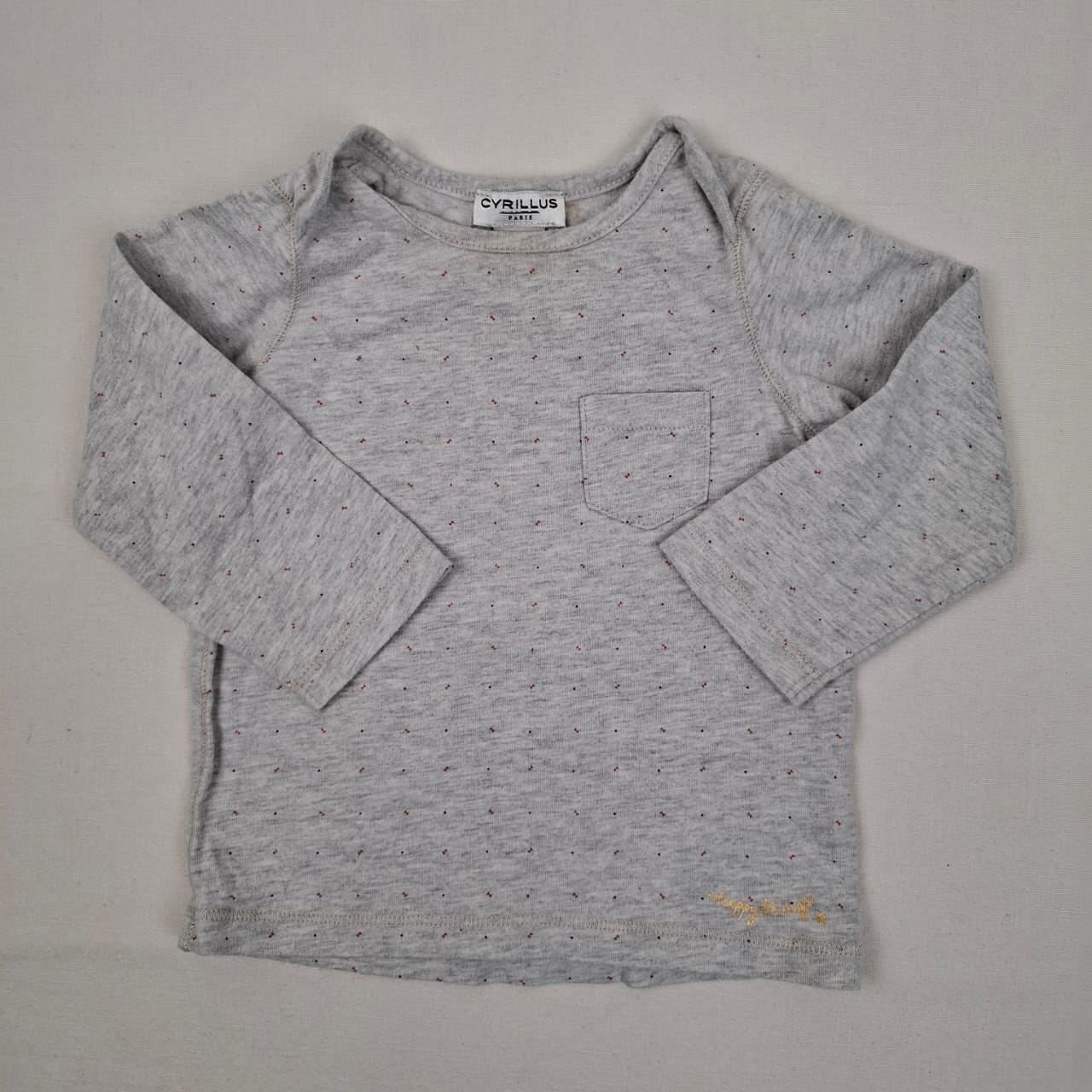 Autres commentaires : T-shirt manches longues cyrillus 12M gris avec points rouge et noir et poche à l’avant