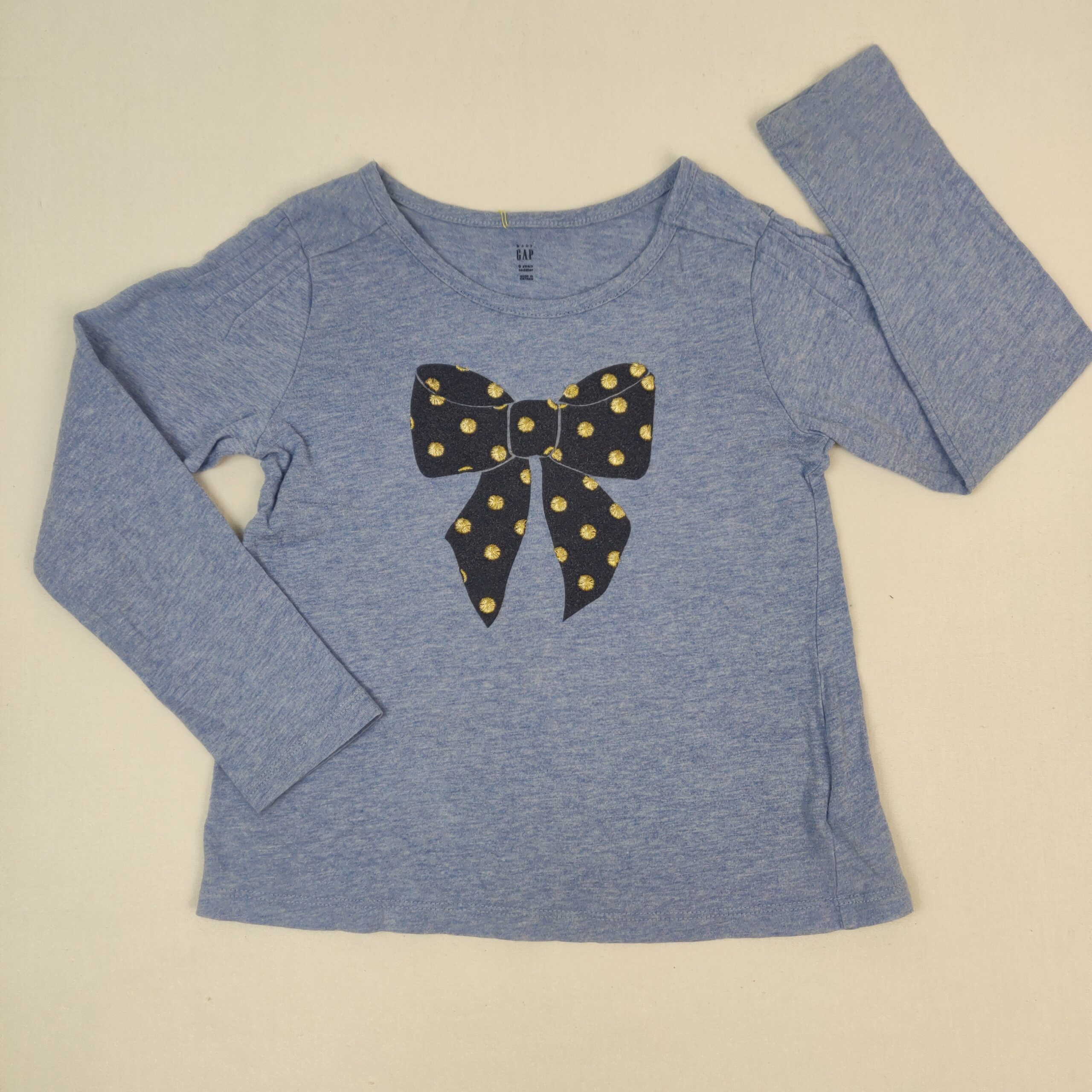 Autres commentaires : T-shirt bleu chiné à manches longues en jersey de coton, col large et arrondi, motif gros noeud gris à pois dorés devant.