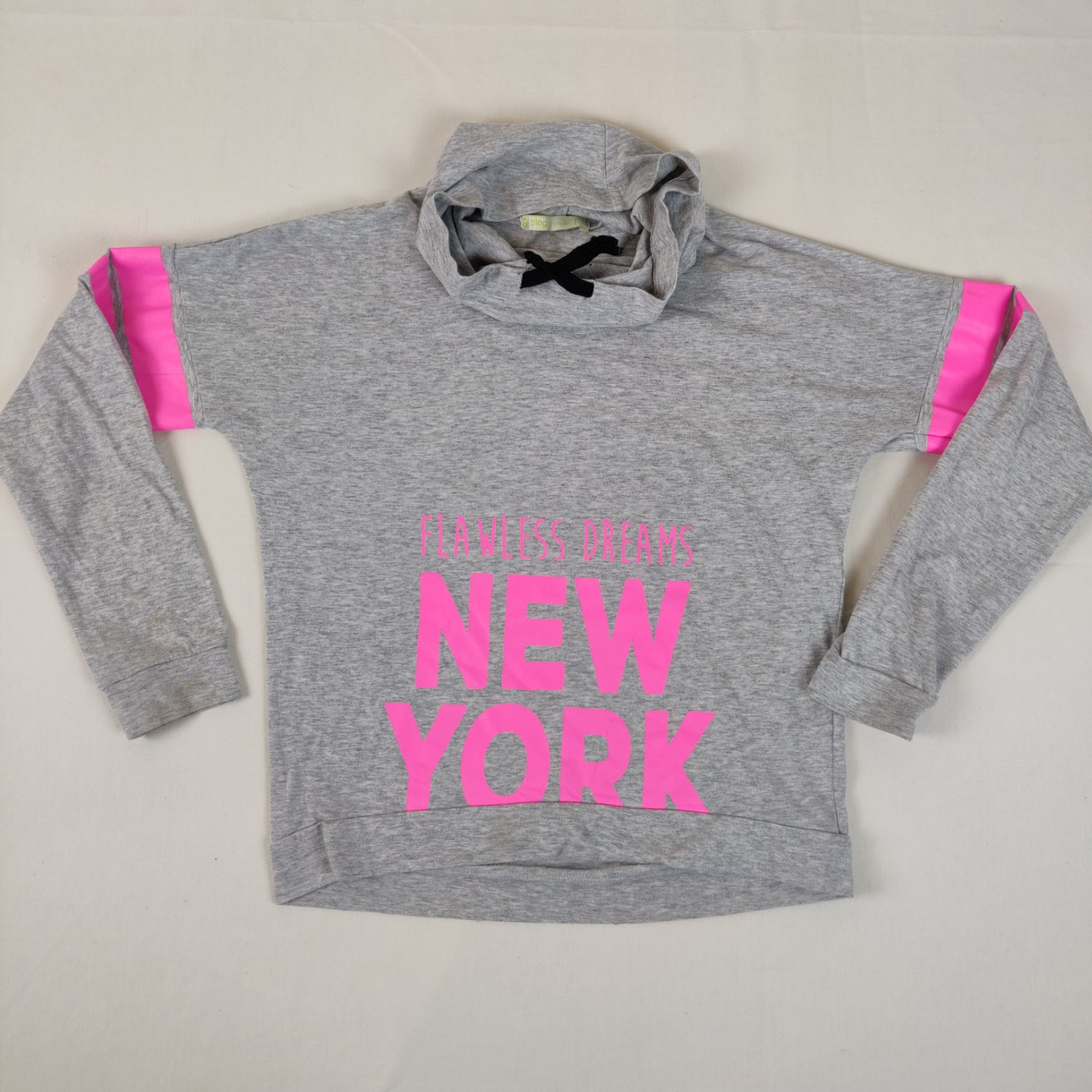 Autres commentaires : 34% coton. T-shirt à manches longues et col roulé avec cordon interne noir – gris chiné avec 2 bandes rose fluo au niveau du haut des manches. Inscription centrale rose fluo « Flawless dreams New York ». Très léger effet pelucheux.