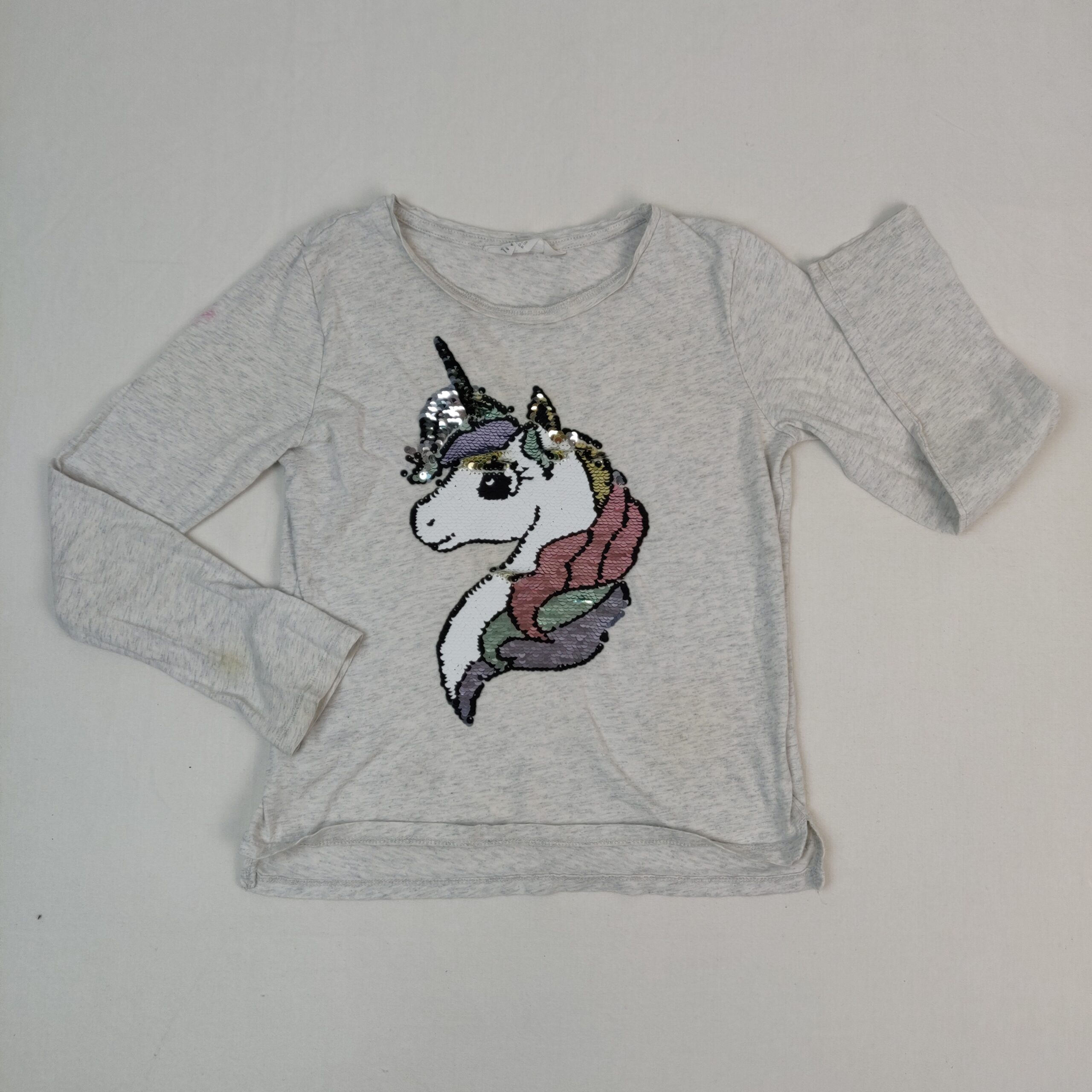 Autres commentaires : Ensemble 2 pièces : 1 T-shirt manches longues gris-beige H&M, col rond, motif licorne à sequins multicolores, petite tache sur la manche droite et 1 leggings gris Orchestra, 55% coton, 40% polyester et 5% élasthannen