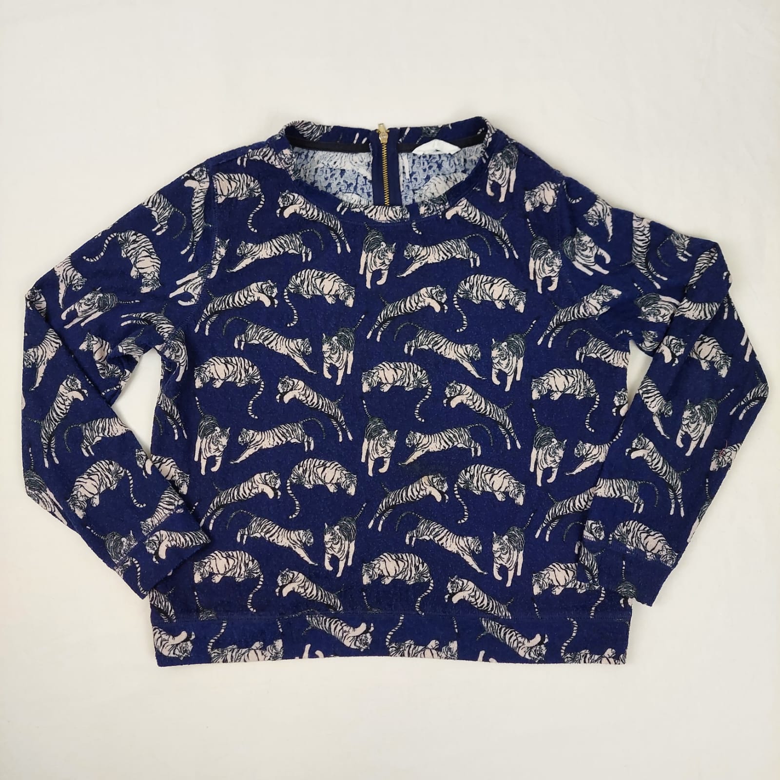 Autres commentaires : 3% élasthanne, T-shirt bleu foncé, motifs tigre, col zip au dos, tache à l’avant discrète
