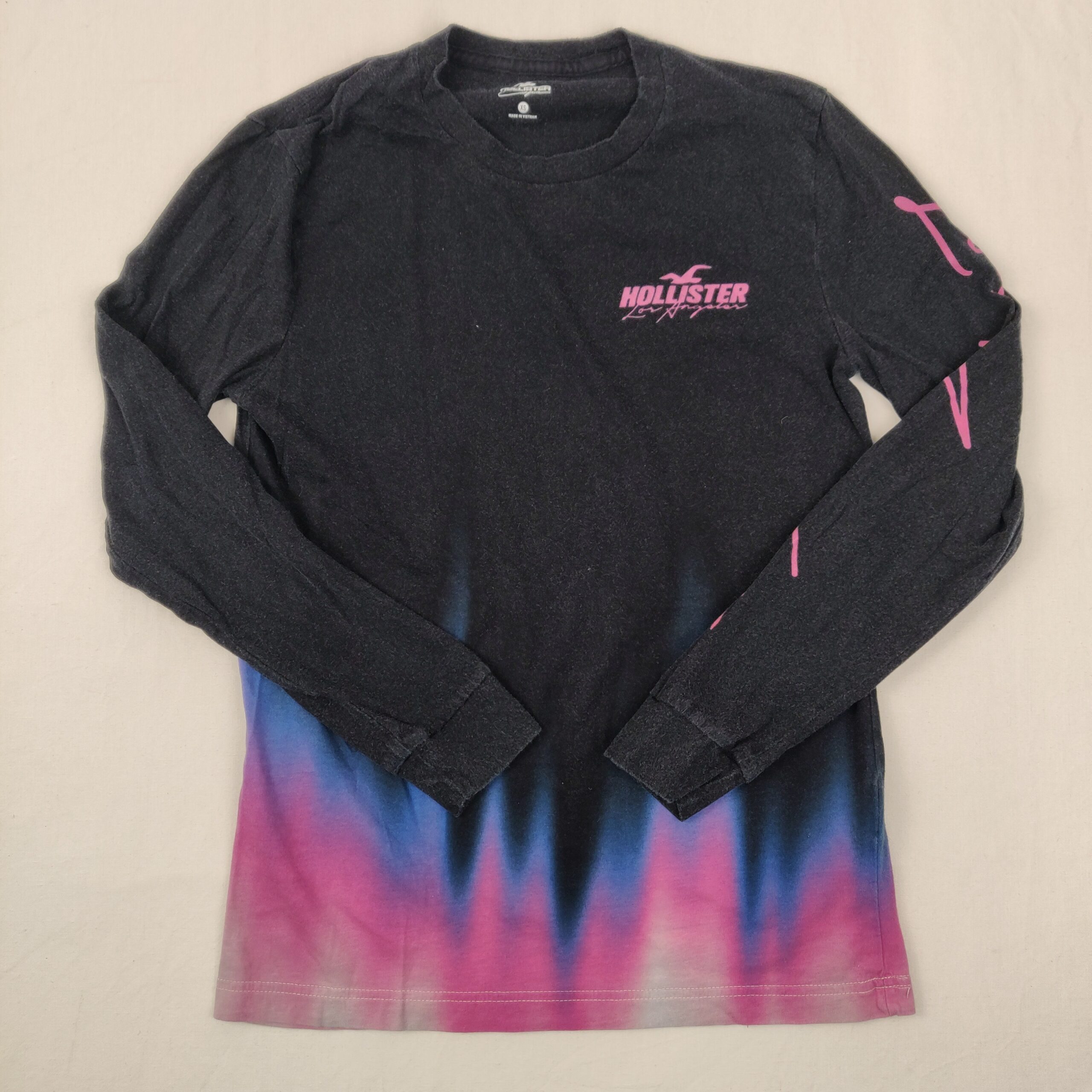 Autres commentaires : T-shirt à manches longues noir avec flammes violettes commencant au bas du T-shirt. Inscription en rose sur la manche droite « Los Angeles ». Devant au niveau du coeur, logo avec inscription « Los Angeles ».