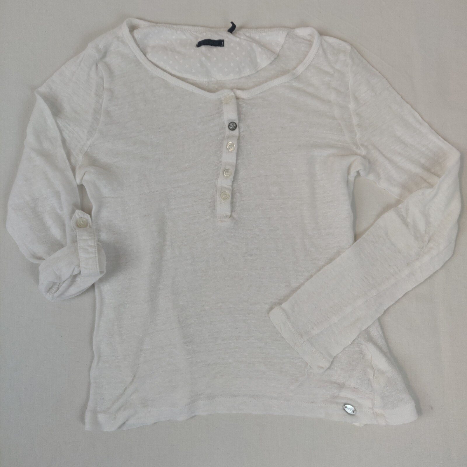 Autres commentaires : 47% Modal, 6% Elasthanne. T-shirt col rond à boutonnière, maille fine, légèrement transparent. Manches retroussables. Petit défaut : trou rappiécé discret au coude droit.