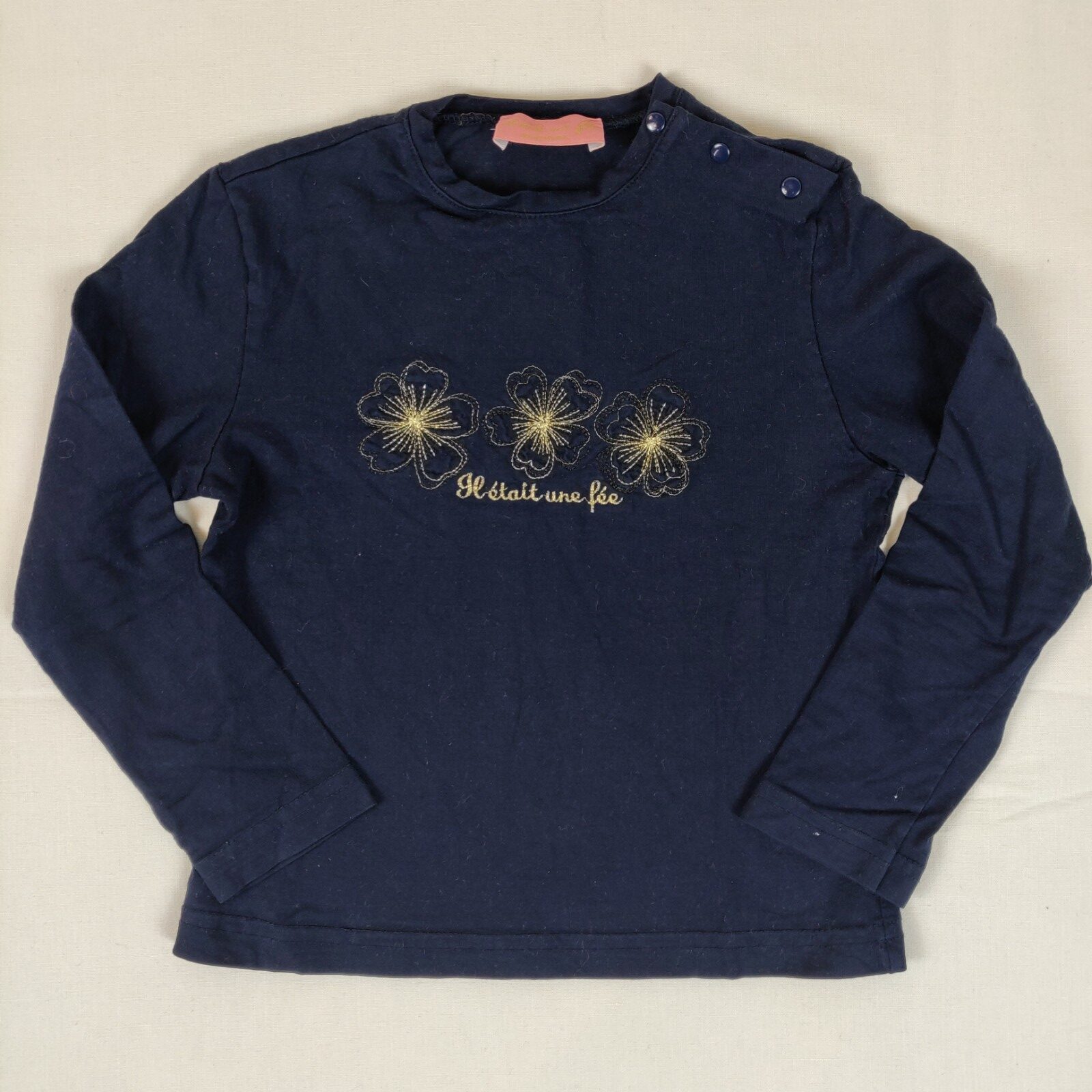 Autres commentaires : T-shirt à manches longues (taille estimée 4 ans) – bleu marine avec en fil doré des motifs centraux 3 fleurs et une inscription « Il était une fée ». Ouverture latérale à 3 boutons pression.