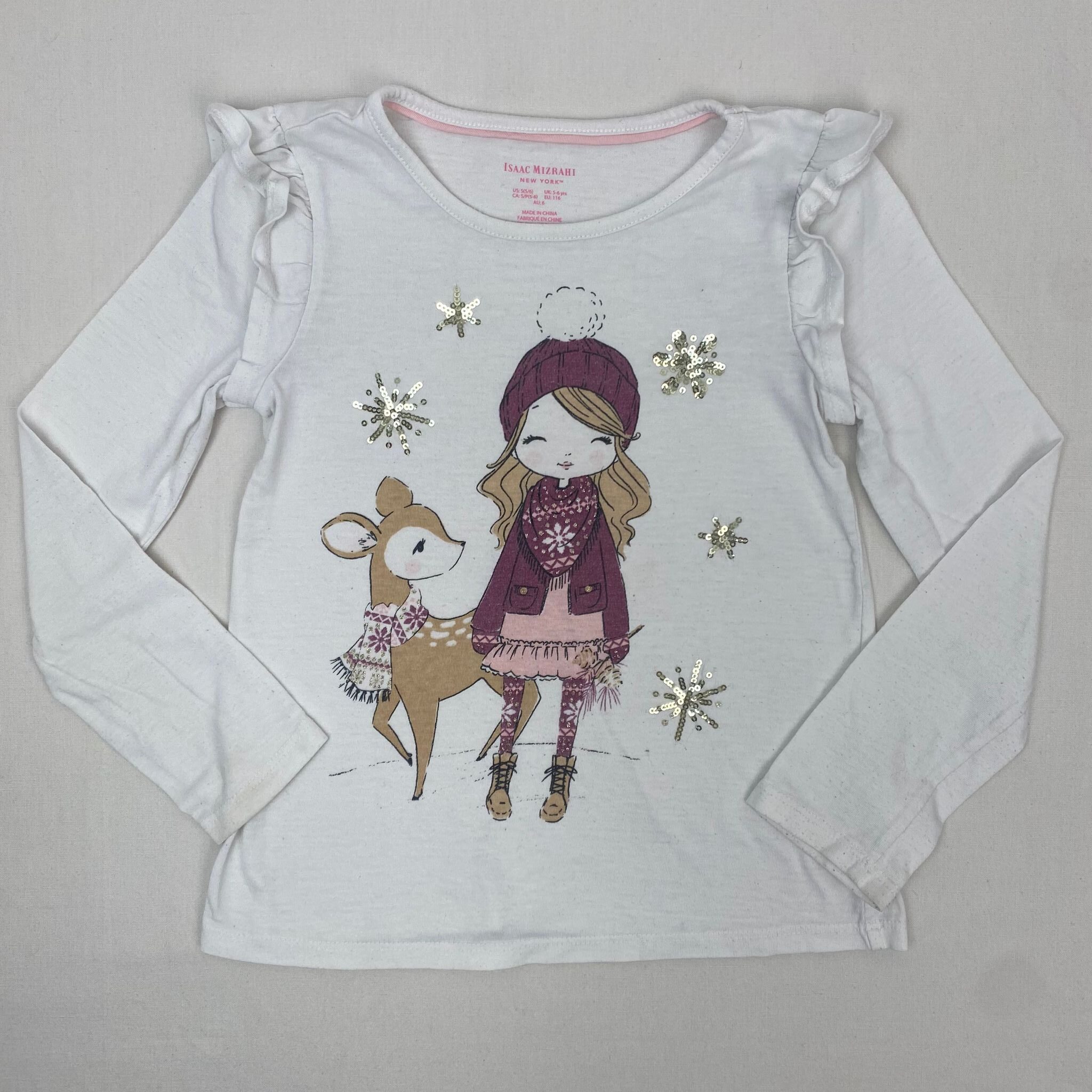 Autres commentaires : 40% polyester. T-shirt blanc manches longues motifs étoiles à sequins et une petiite fille.
