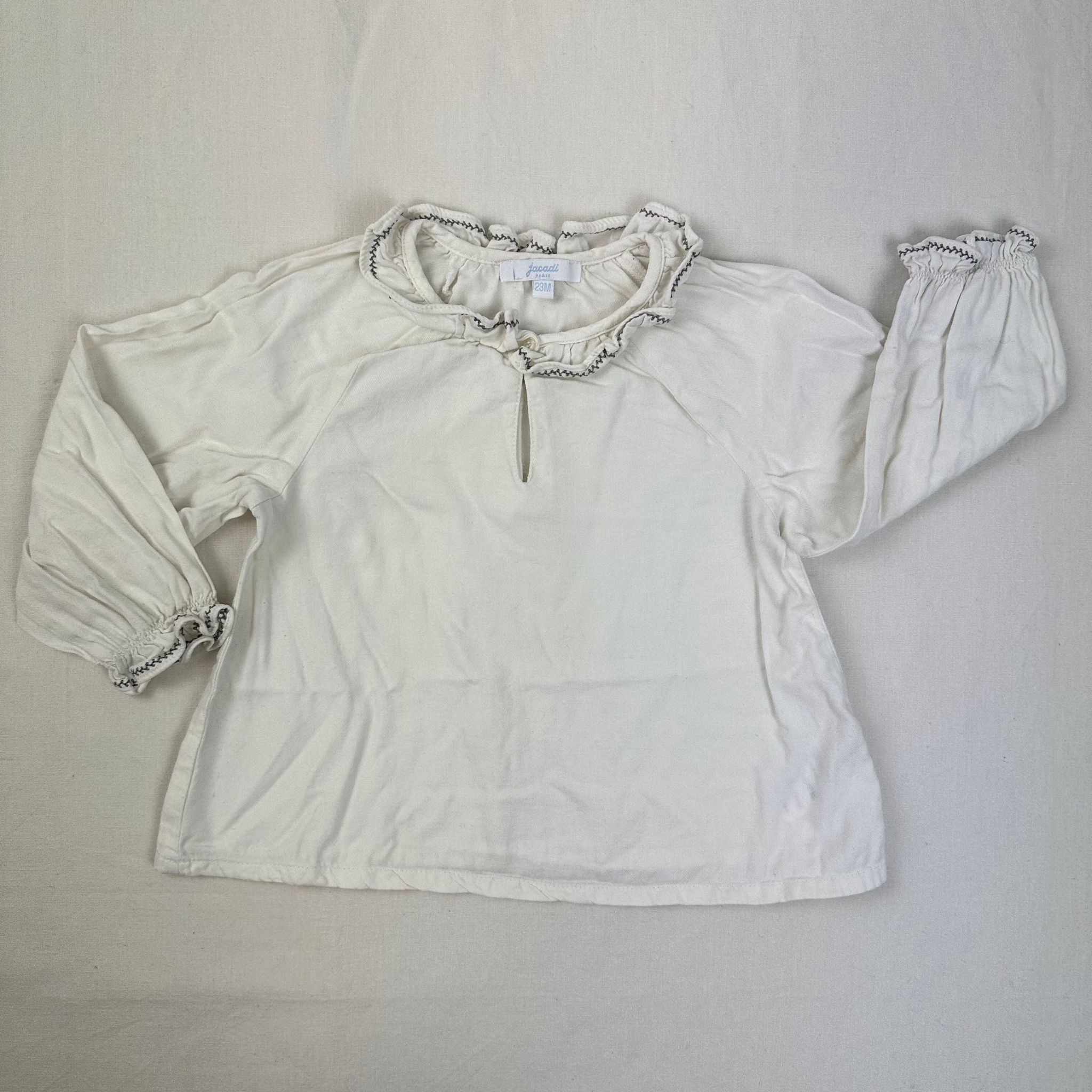 Autres commentaires : 20% laine. T-shirt manches longues blanc, col collerette et une fermeture au col par boutons.