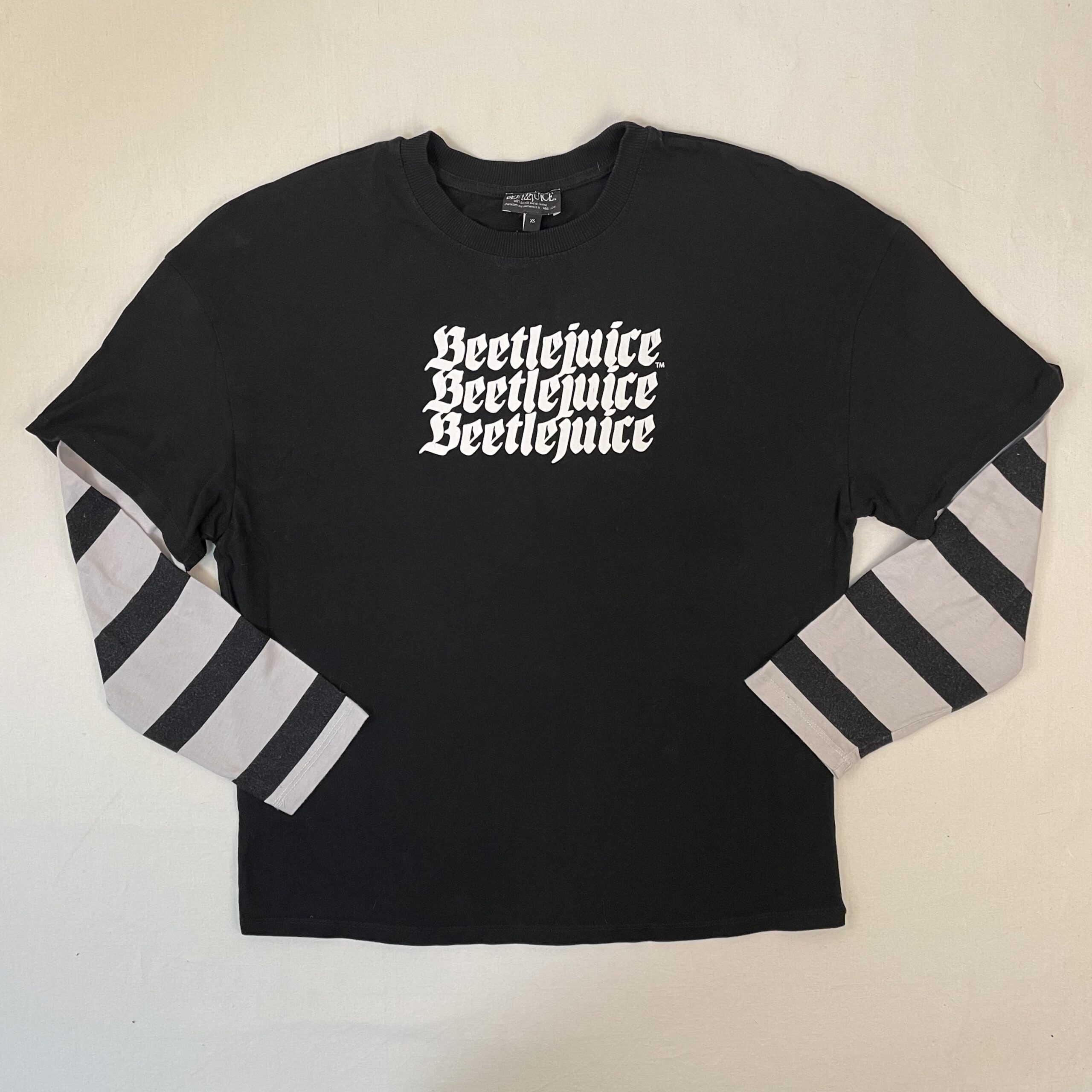 - T-shirt noir avec effet superposition au niveau des manches blanches à rayures noires, devant plusieurs inscriptions « Beetlejuice » en blanc.