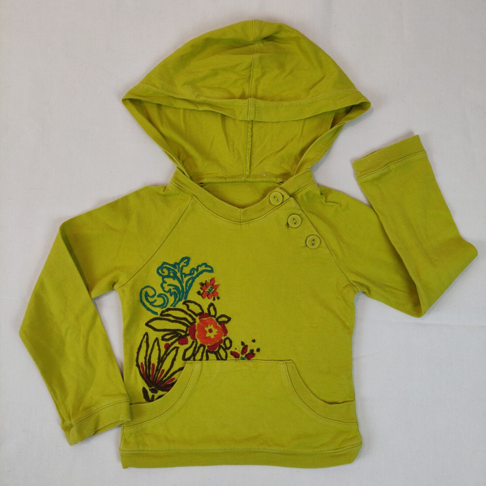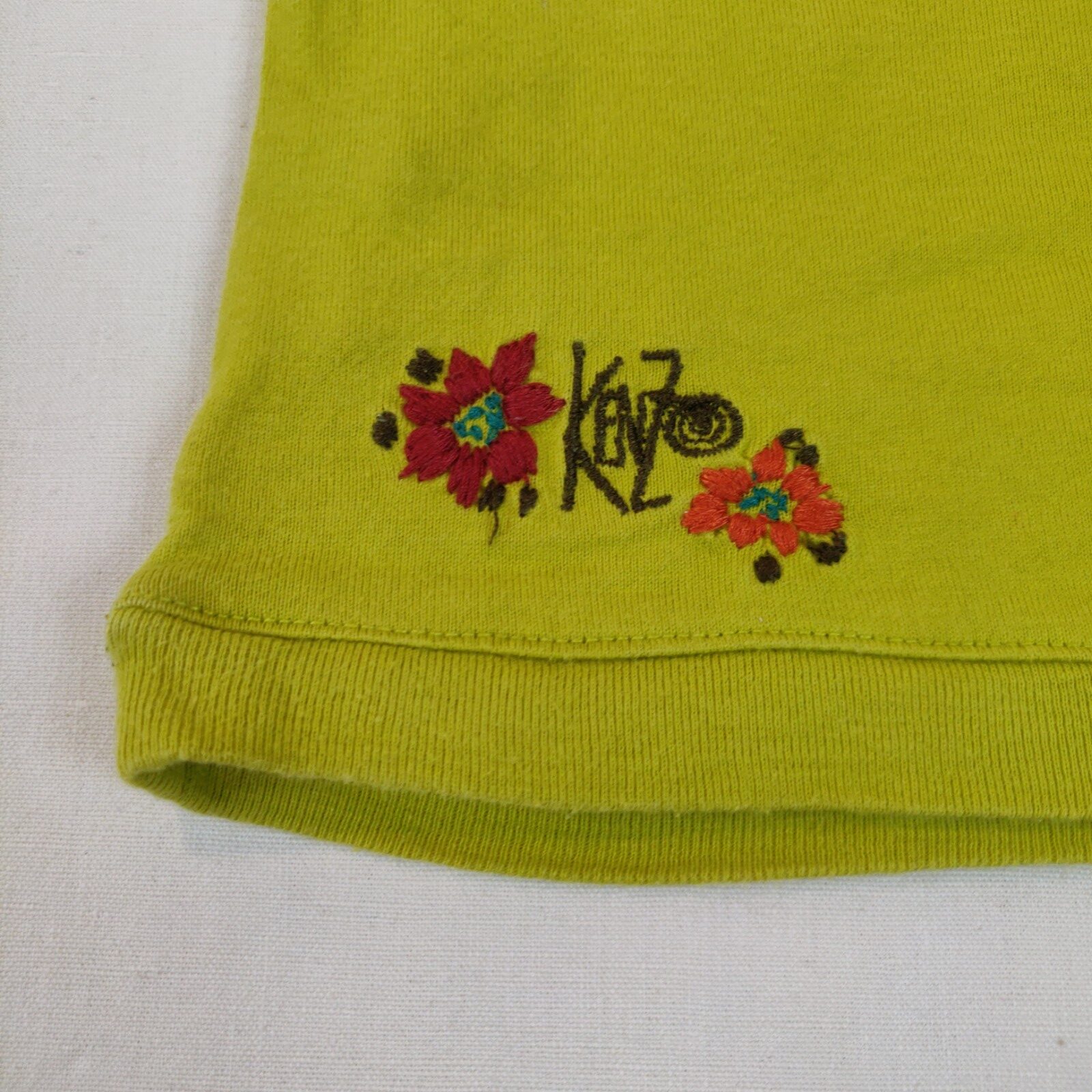 Autres commentaires : T-shirt à mi-chemin avec sweat manches longues à capuche – vert-jaune avec motifs floraux centraux brodés. 1 double poche centrale. Griffe Kenzo brodée à l’arrière (sans étiquette de la marque : niveau abaissé de melon à banane). Ouverture oblique à partir du col à 3 boutons recouverts de tissu vert-jaune. Un bouton supplémentaire fourni.