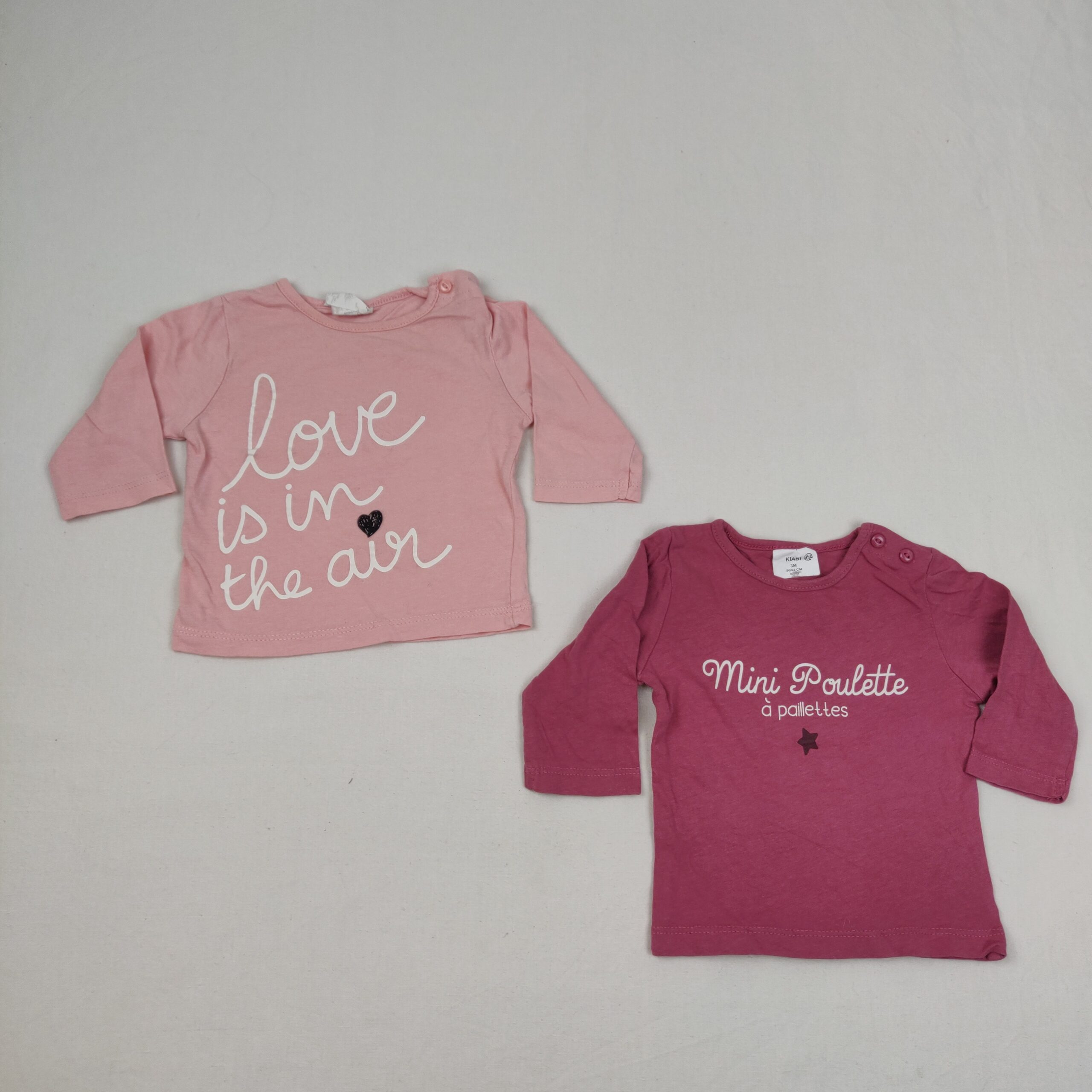 Autres commentaires : Lot de 2 T-shirts Kiabi à manches longues, dont – 1 de couleur vieux rose , col rond avec ouverture par boutons classique à gauche du col, inscription centrale devant et en blanc « Mini Poulette à paillettes » – 1 rose pâle 100% coton, col rond avec ouverture par boutons classique à gauche du col, inscription centrale devant et en blanc « love is in the air » avec un coeur noir dessiné à la place du point du i .