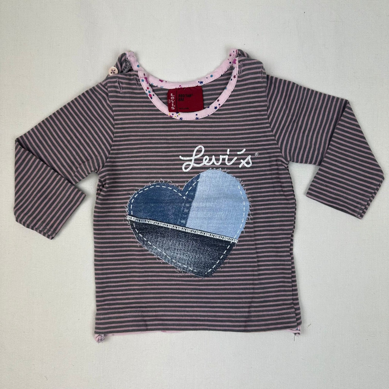 Autres commentaires : T-shirt manches longues rose avec rayures grises motif un coeur bleu et une fermeture à l’épaule par boutons.