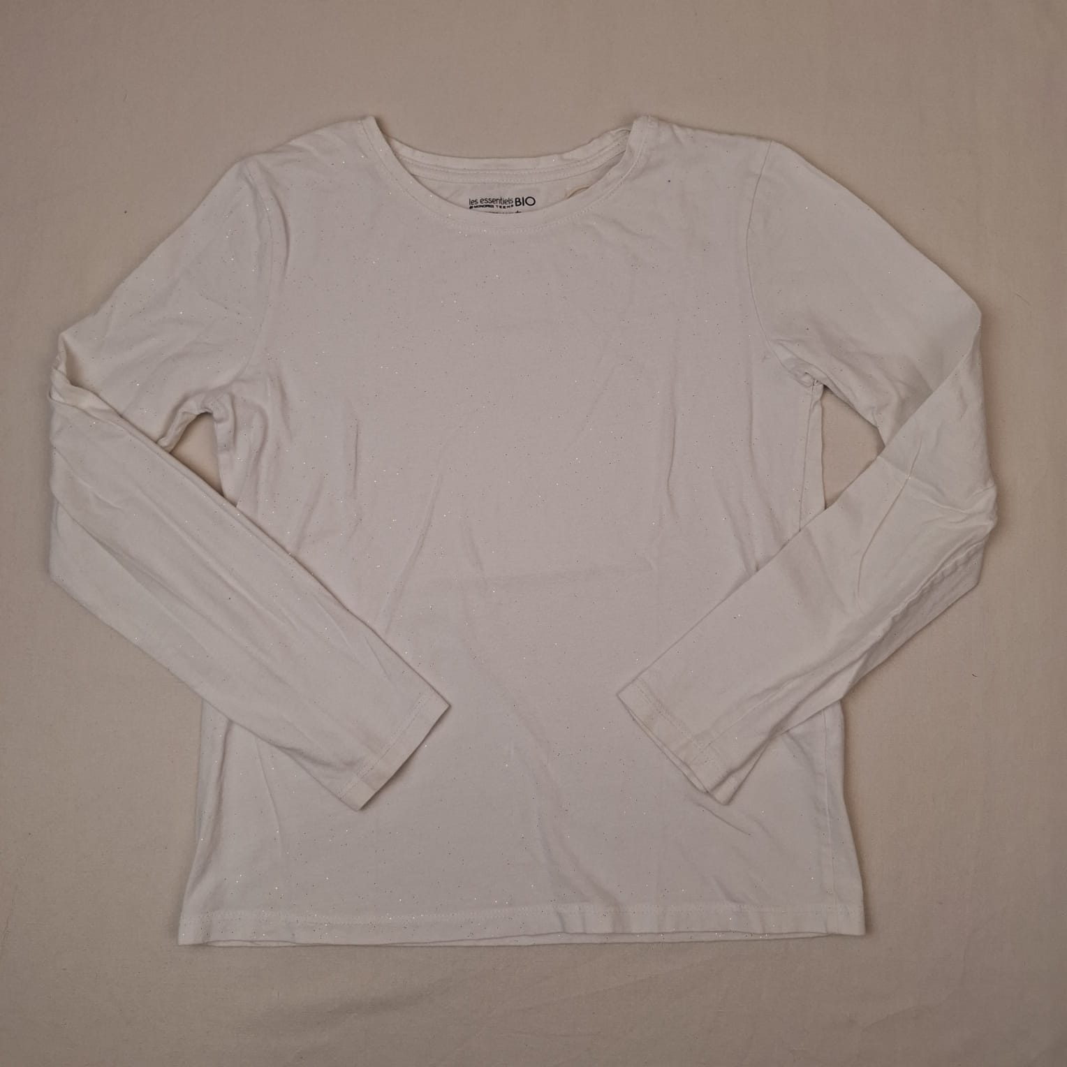Autres commentaires : T-shirt blanc à petites paillettes dorées, manches longues, col rond.