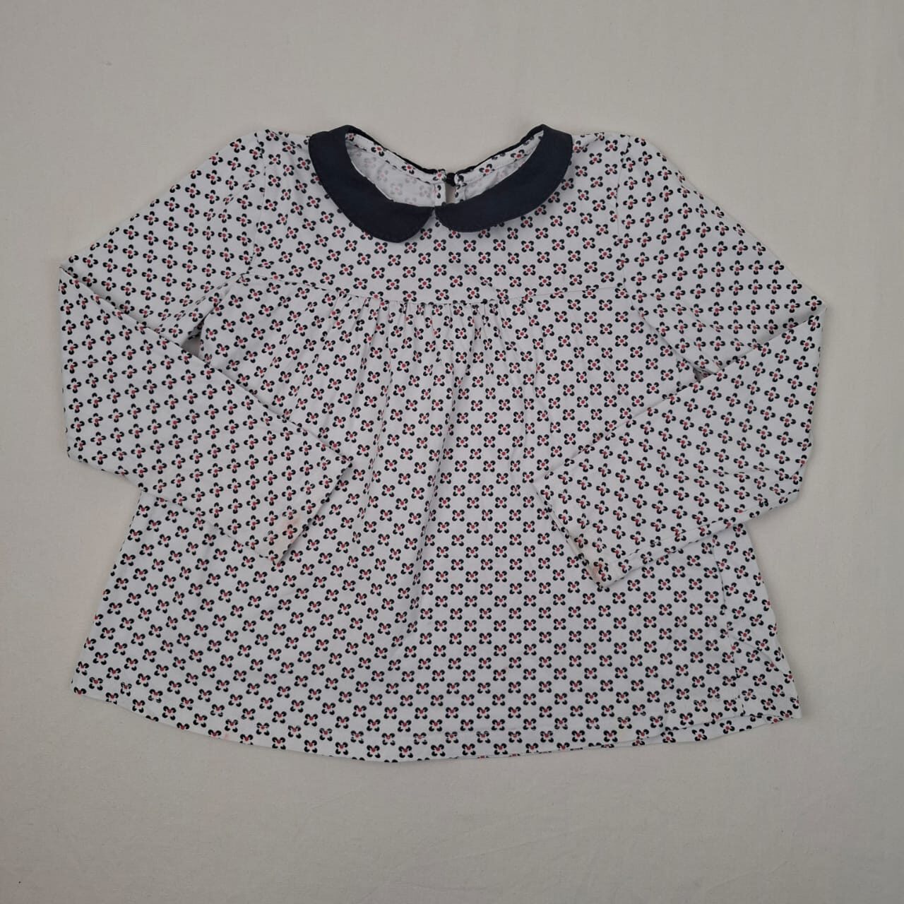 Autres commentaires : T-shirt blanc, Monoprix, 8ans, Col claudine bleu foncé avec deux boutons pour ouvrir le col, motifs fleurs noir et rouge sur tout le vêtement, manche légèrement taché