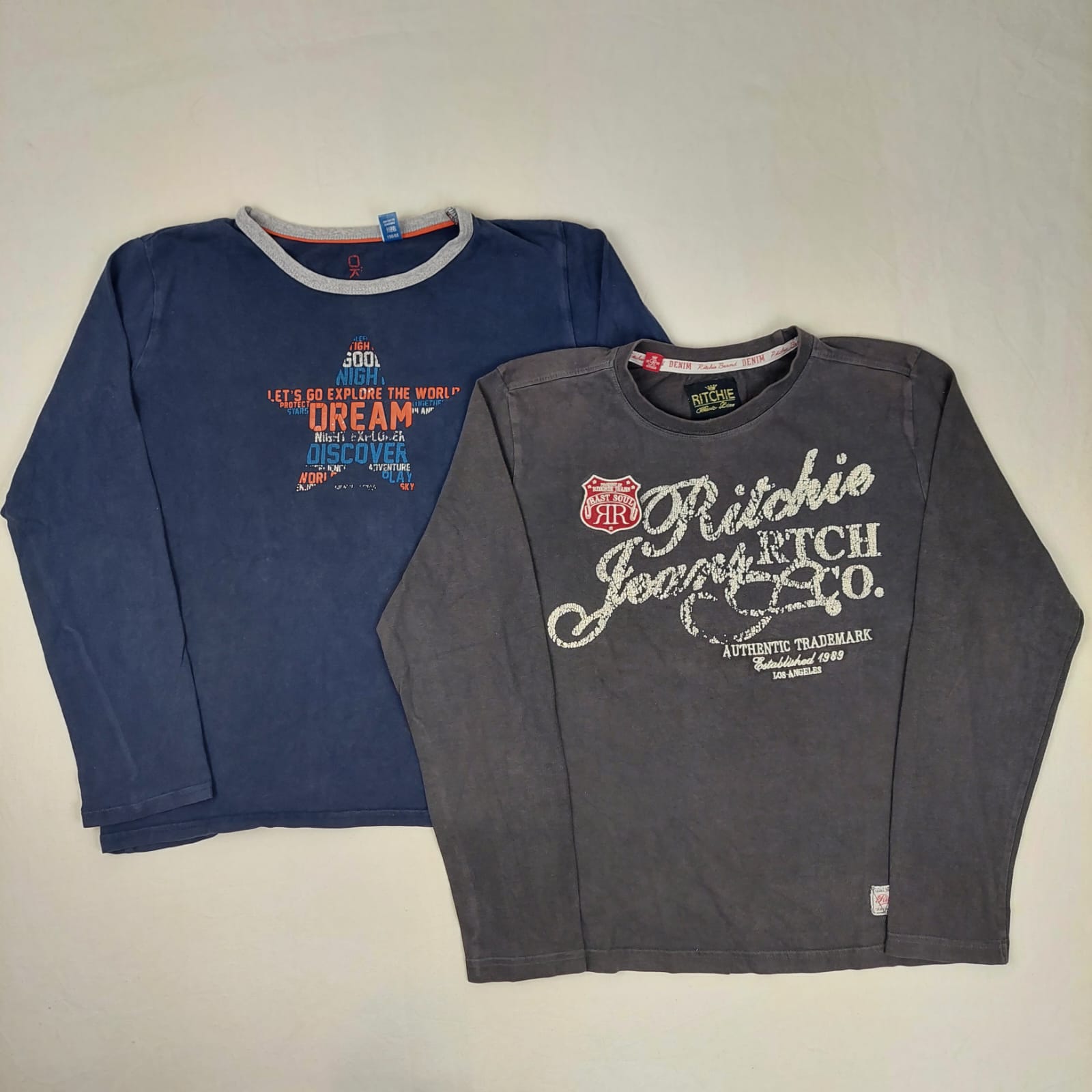 Autres commentaires : Lot 2 t-shirts manches longues, un bleu foncé imprimé, un gris imprimé légèrement abimé « Richie », brodé blason, tache de décoloration assez discrète à l’arrière