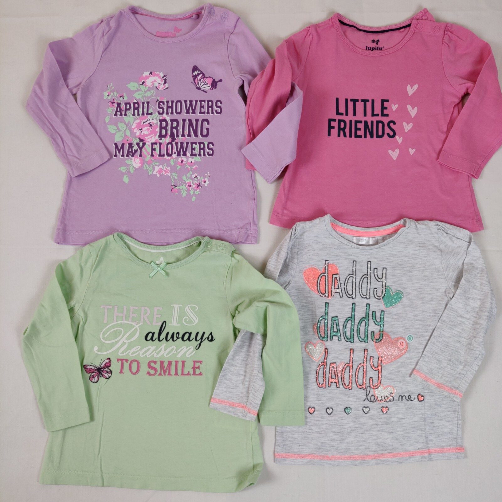 Autres commentaires : Lot de 4 t-shirts à manches longues. Un t-shirt « Lupilu » parme à motifs centraux floraux roses, verts, blancs et violets. Inscription « April showers bring may flowers ». Ouverture latérale à 2 boutons pression. Un t-shirt « Lupilu » vert avec inscription centrale « There is always reason to smile ». Ouverture latérale à 2 boutons pression. Très léger effet pelucheux. Un t-shirt « Lupilu » rose avec motifs coeurs rose pâle et inscription noire « Little friend ». Ouverture latérale à 2 boutons pression. Un t-shirt « Pepco » gris clair chiné avec coeurs et inscription pailletés « Daddy daddy daddy loves me ».