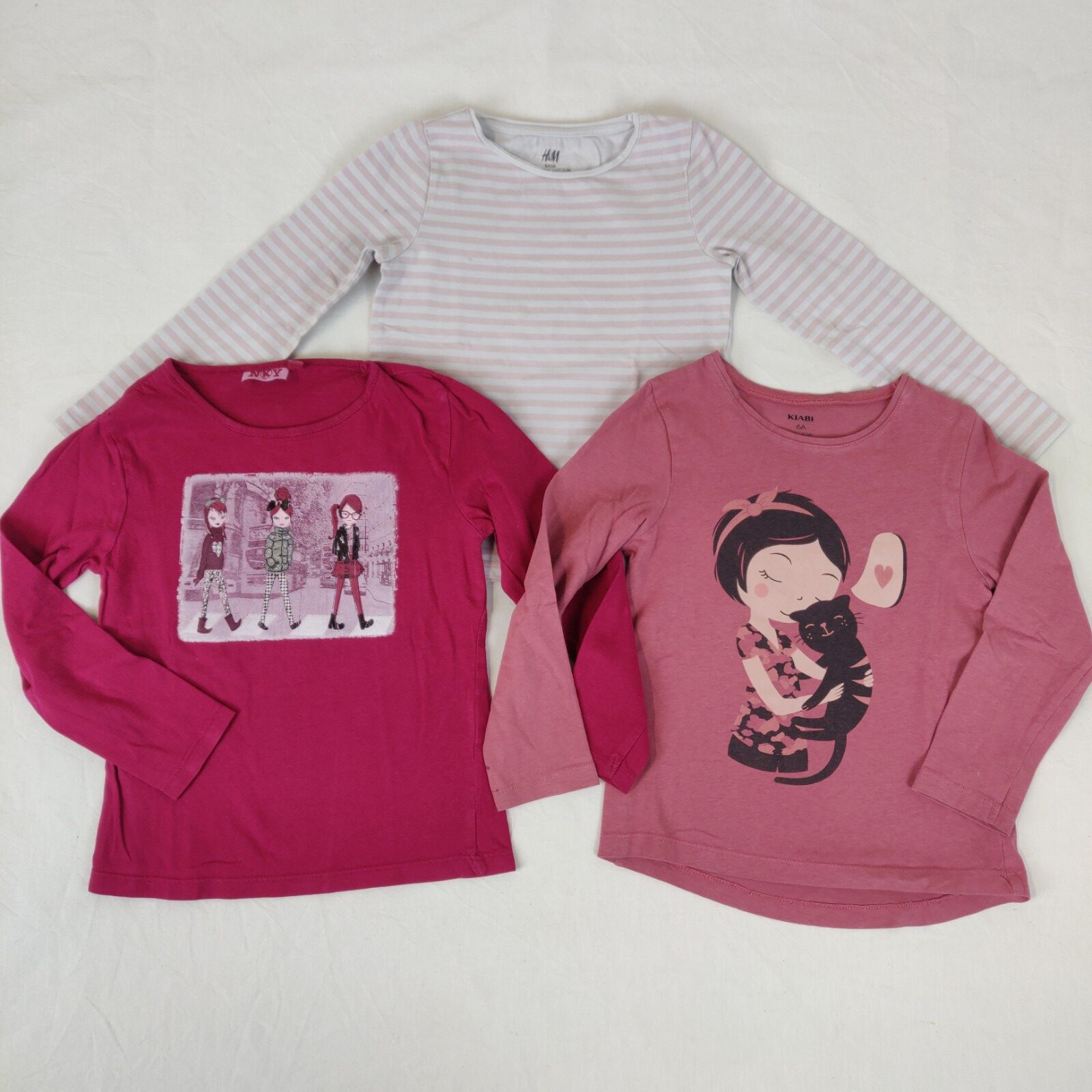 Autres commentaires : Lot de 2-shirts à manches longues – rose. Un t-shirt avec un motif central filles dans le vent. Un t-shirt avec motif central petite fille calinant un chat. Un t-shirt blanc rayé rose un peu tâché Offert.